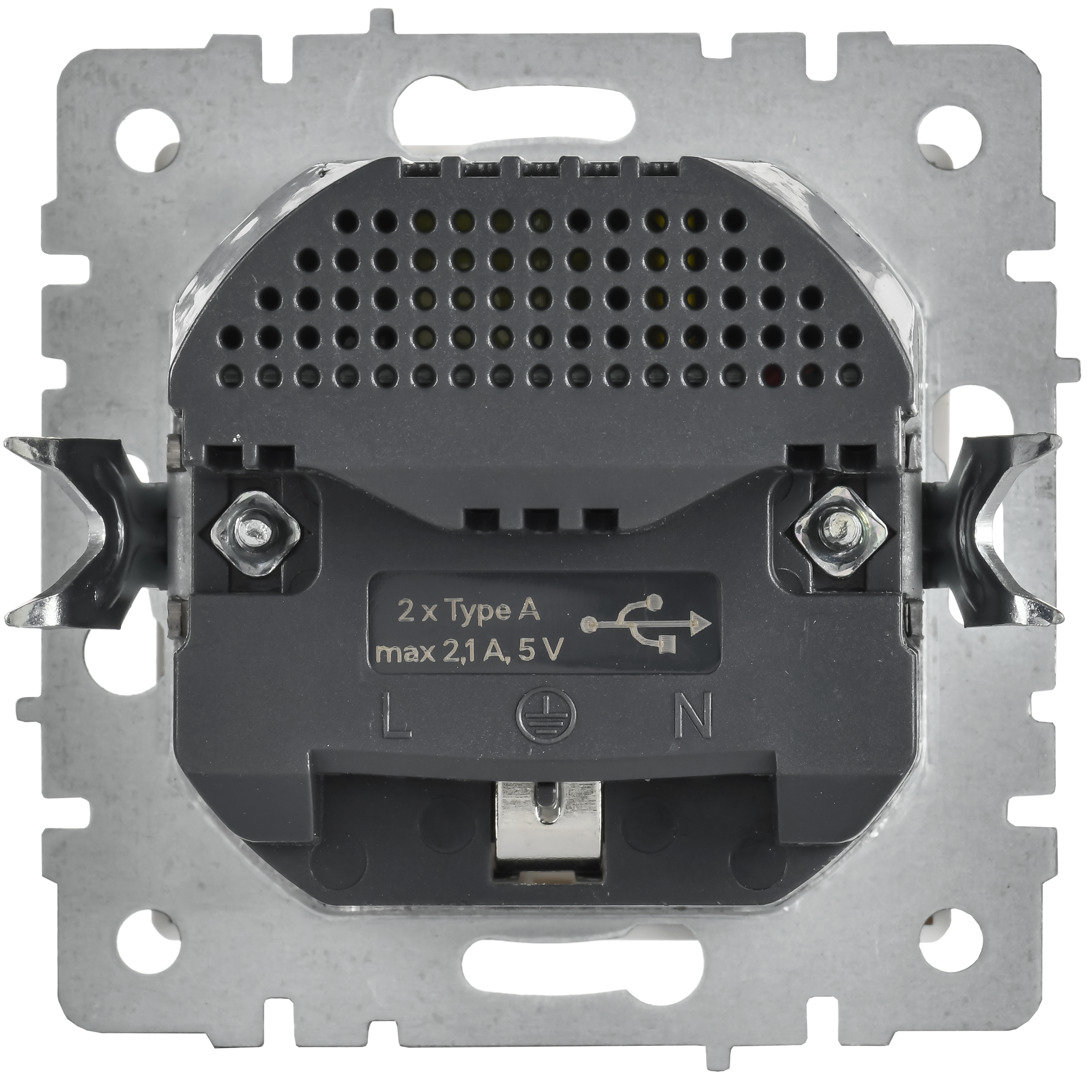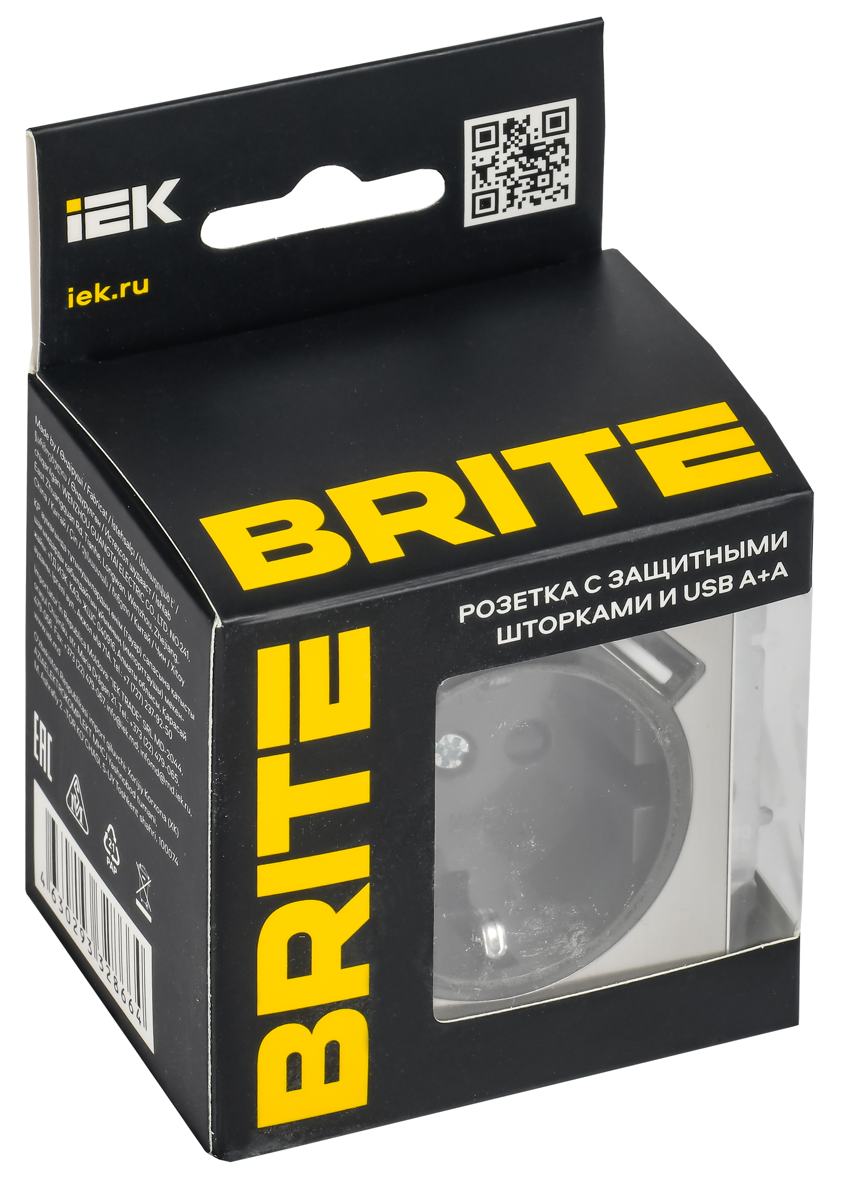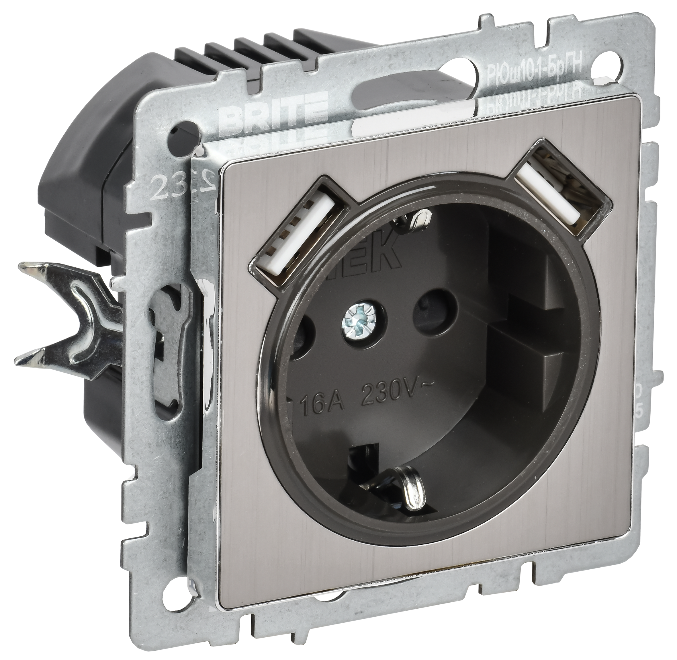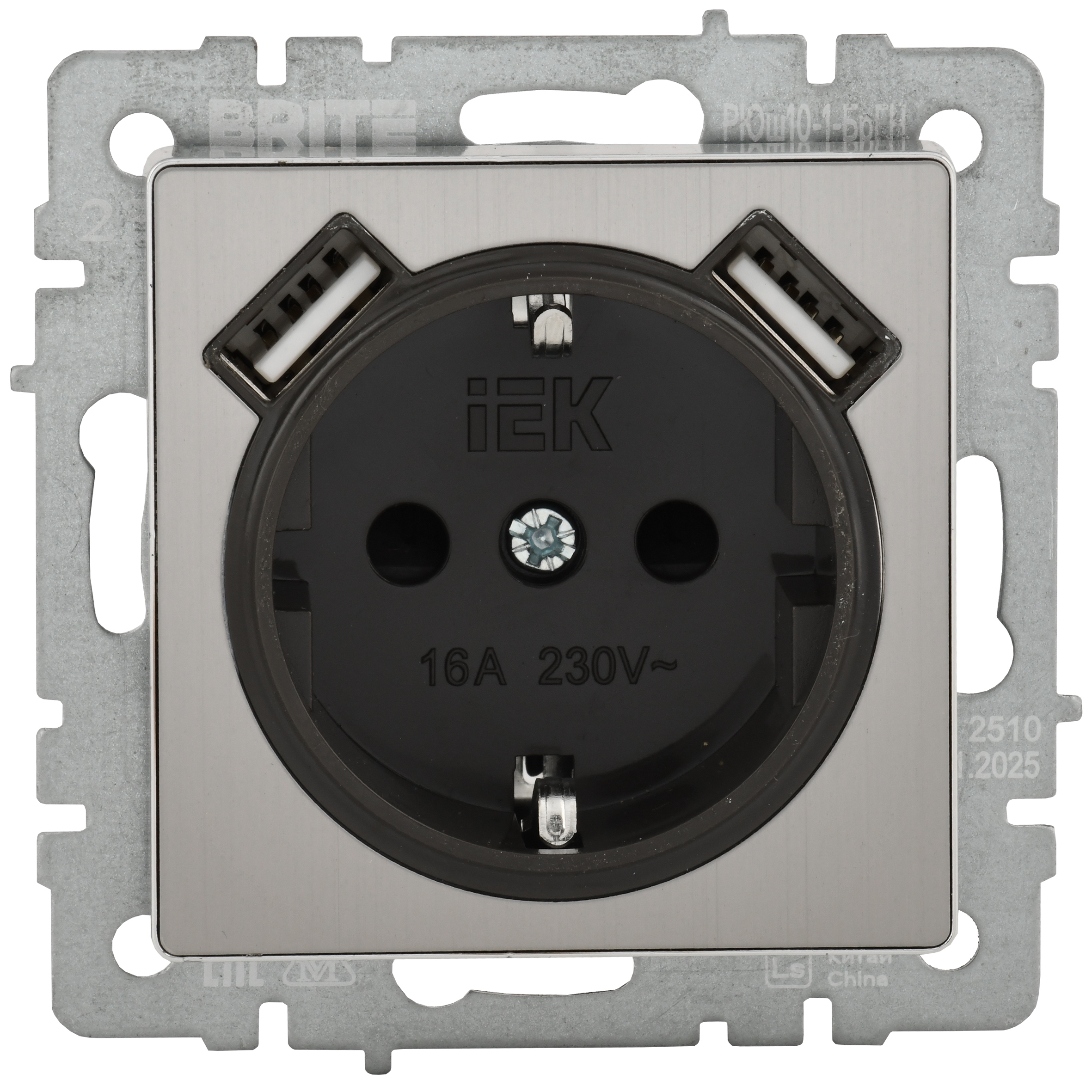 BRITE Розетка 1-местная с заземлением с защитными шторками 16А с USB A+A 5В 2,1А РЮш10-1-БрГН металл хром/никель IEK