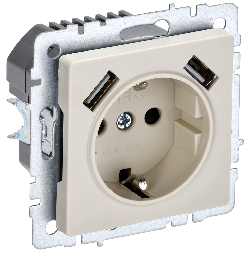 BRITE Розетка 1-местная с заземлением с защитными шторками 16А с USB A+A 5В 2,1А РЮш10-1-БрКр бежевый IEK