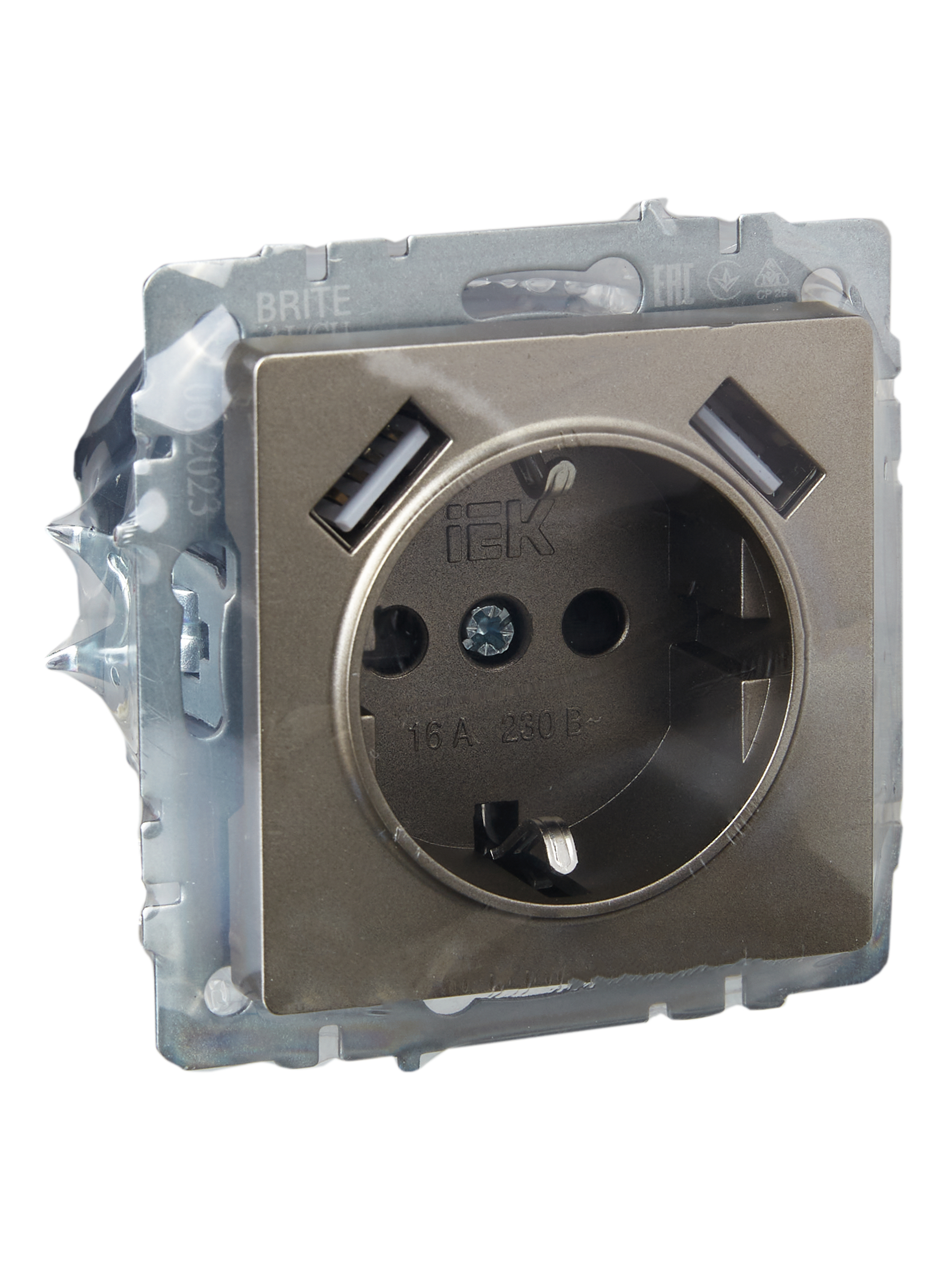 BRITE Розетка 1-местная с заземлением с защитными шторками 16А с USB A+A 5В 2,1А РЮш10-1-БрШ шампань IEK