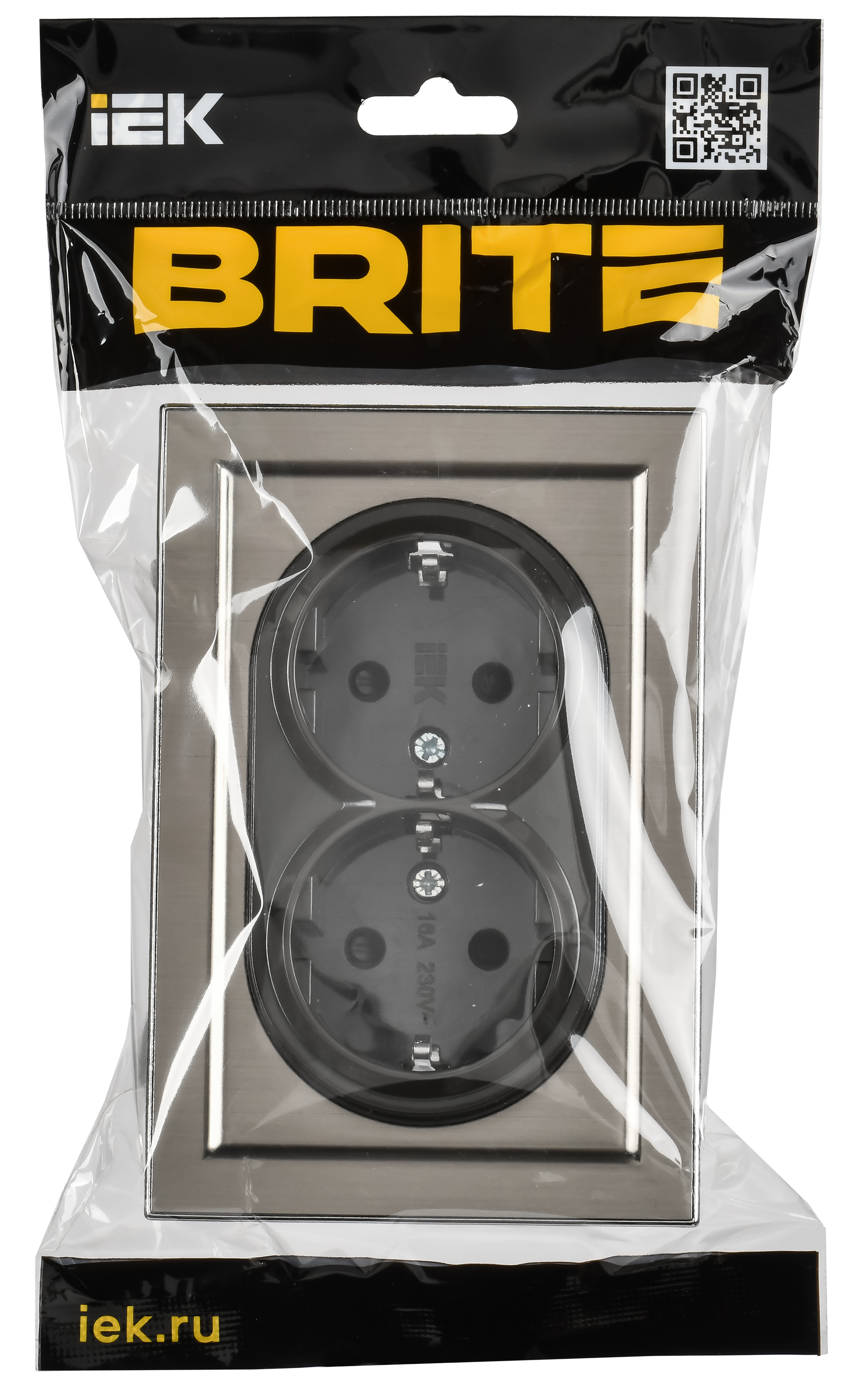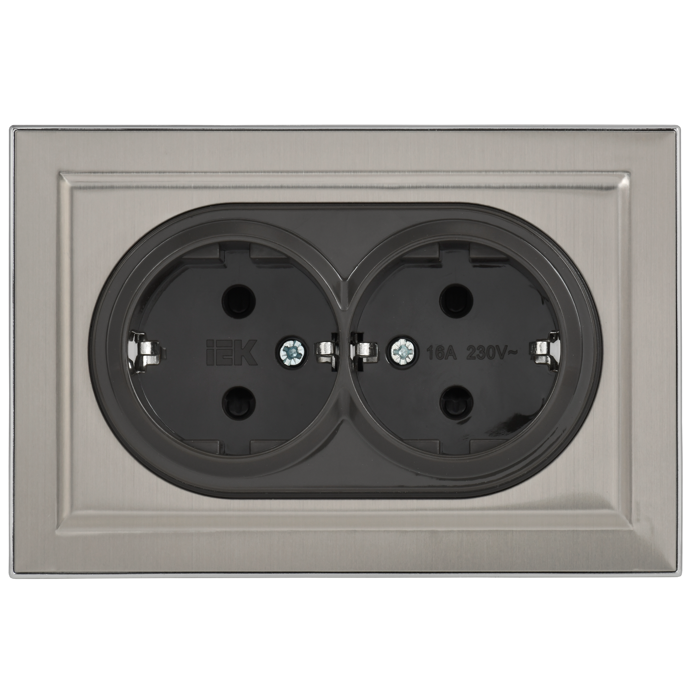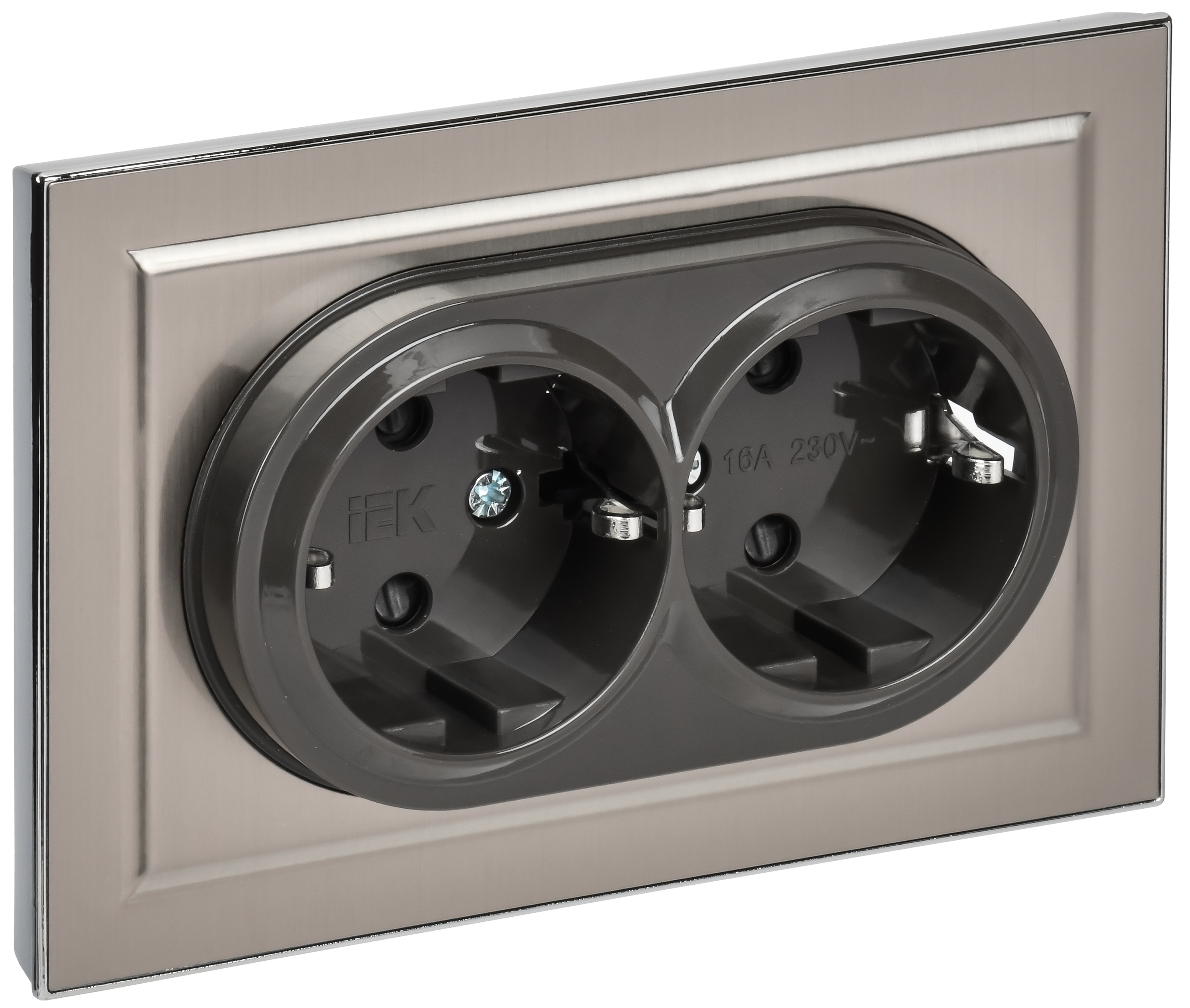 BRITE Розетка 2-местная с заземлением с защитными шторками 16А в сборе РСш12-3-БрГН металл хром/никель IEK