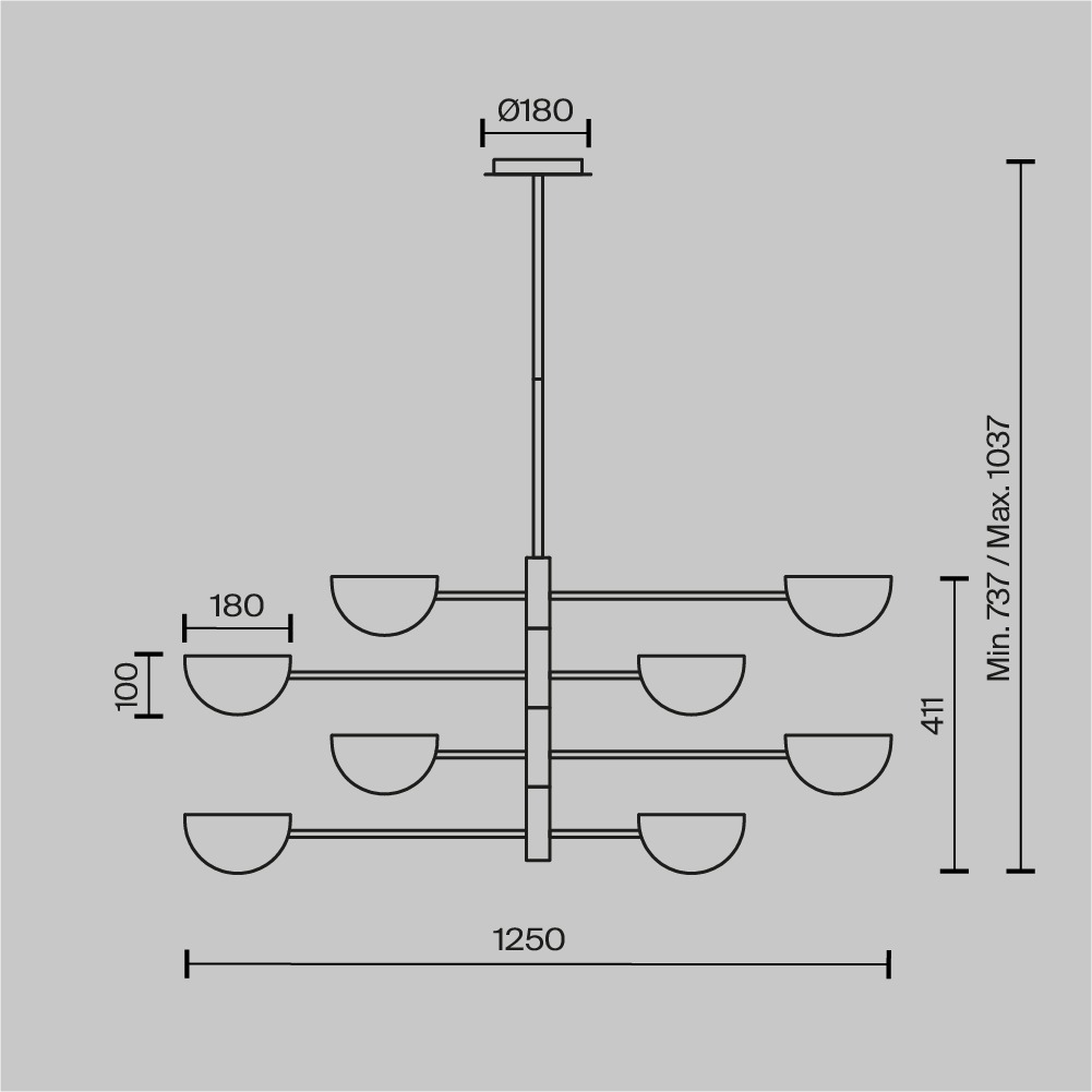 Арматура и плафоны из металла, цвет – черный. Оригинальная форма плафона с плавным контуром. Источники света скрыты под акриловым рассеивателем.