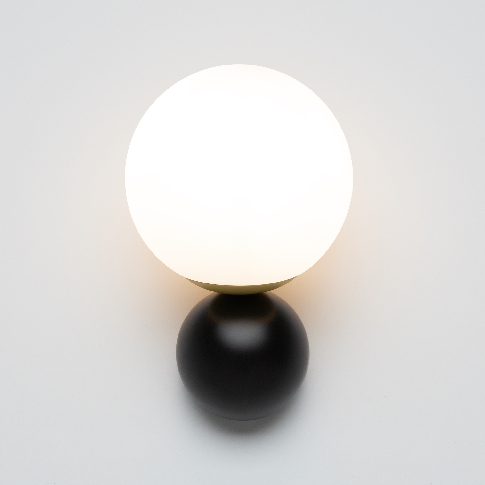 Арматура из металла в цвете матового золота. Плафоны-сферы из матового выдувного стекла. Модная асимметрия в дизайне. Источник света — лампы с цоколем Е14.