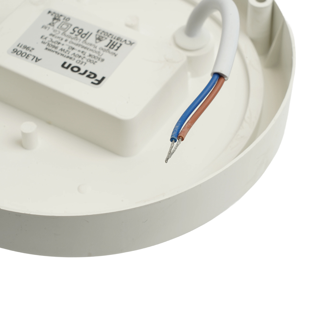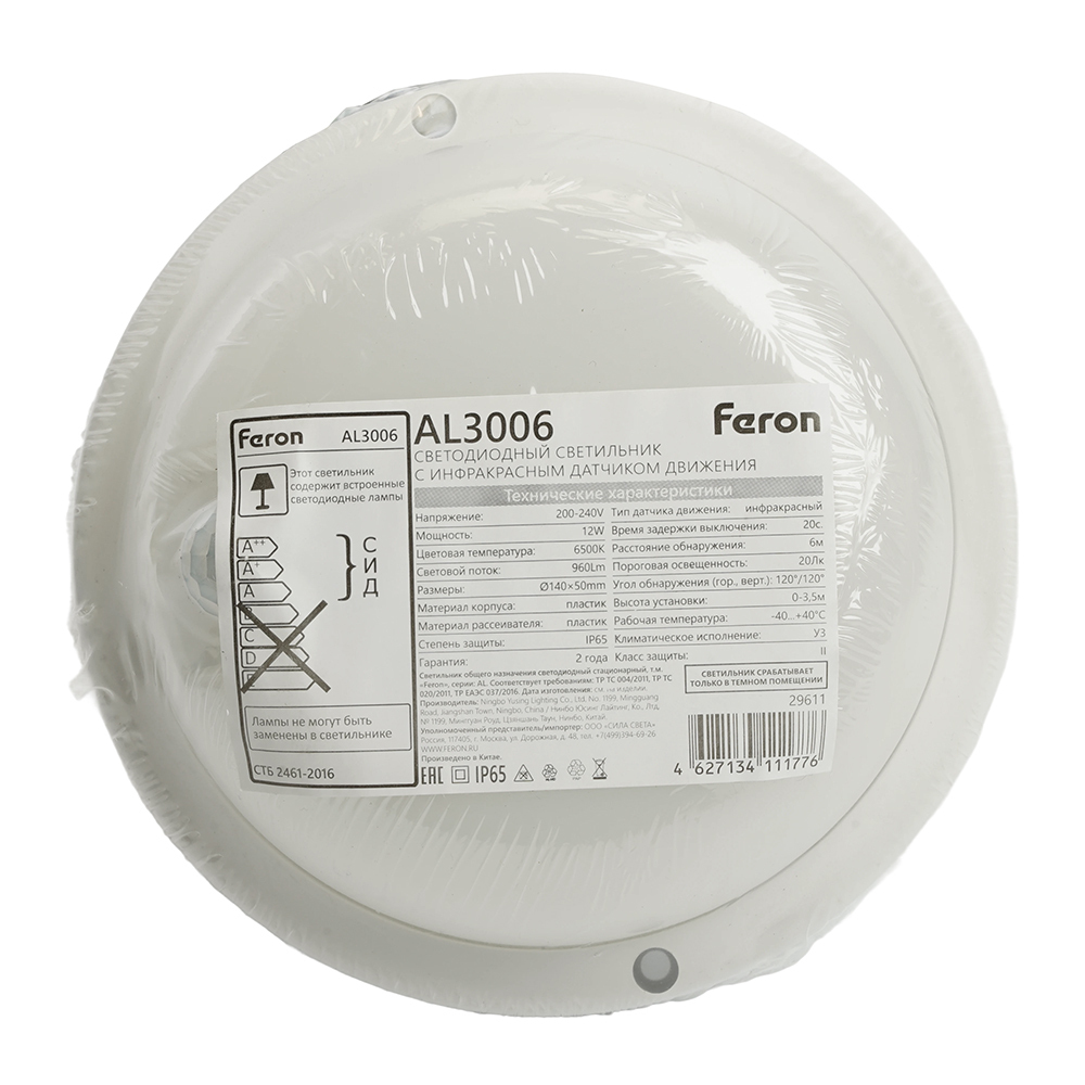 Светильник накладной светодиодный, пылевлагозащищённый (ДПБ) FERON AL3006, 12W, 6500К (дневной), 200-240V, 960Lm, IP65, угол рассеивания 120°, цвет белый, корпус пластик, рассеиватель пластик, 140*140*50
