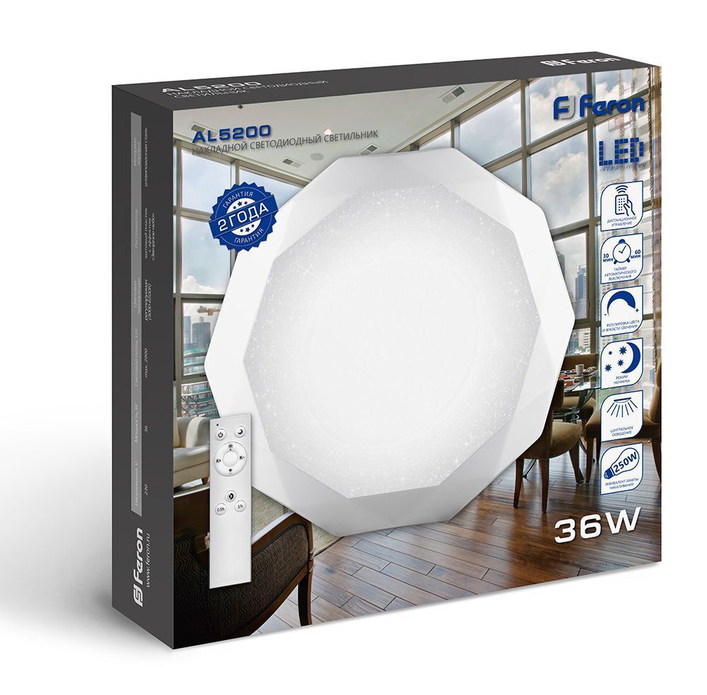 Светильник накладной светодиодный, потолочный управляемый (ДПО) FERON AL5200, 36W, 3000К-6000K (теплый-белый-дневной), 230V, 2900Lm, IP20, угол рассеивания 120°, цвет белый, корпус штампованная сталь, рассеиватель матовый пластик, серия "звездное небо", 410*410*90