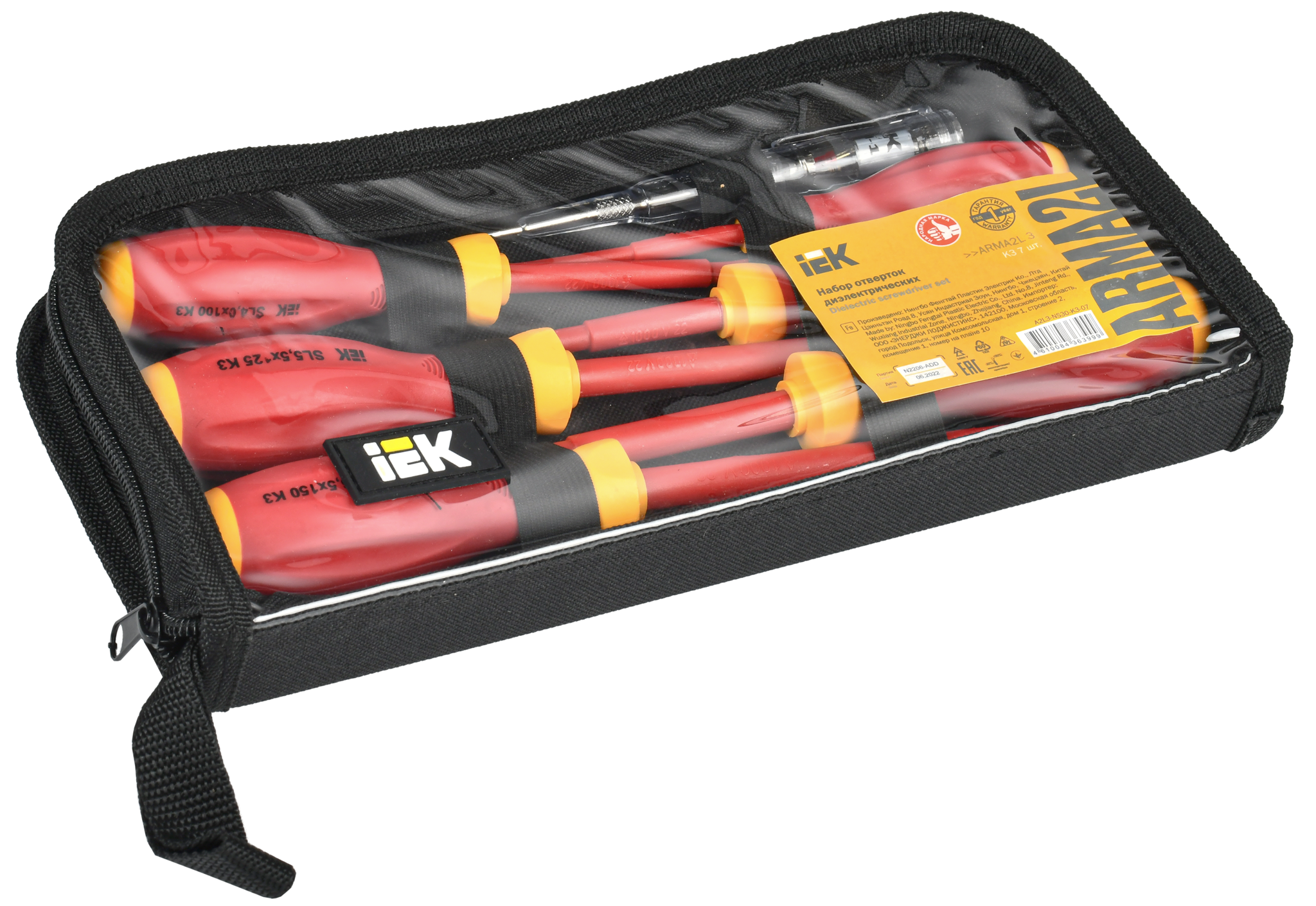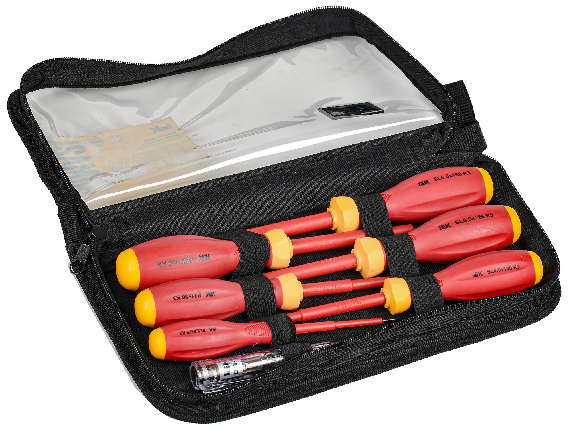 Набор диэлектрических отверток серии К3 рассчитан на использование под напряжением до 1000В. Набор включает в себя: крестообразные отвертки PZ1x80, PZ2х100; шлицевые - SL2,5х75, SL4,0х100, SL5,5х125, SL6,5х150 и отвертку-пробник ОП-1. Материал рукояток – полипропилен и поливинилхлорид PP+PVC..