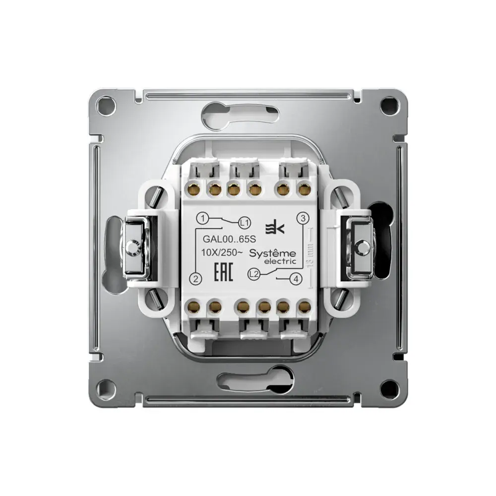 Механизм с быстрозажимными клеммами Systeme Electric серии ArtGallery в цвете белый переключателя 2-клавишного подходит для сетей 250 В, на ток 10 А. С помощью новых быстрозажимных клемм монтаж стал быстрее. Для подключения не требуется отвертка. Пластик с ионами серебра в белом цвете обеспечивает антибактериальный эффект. Лицевые детали из качественного ABS-пластика, устойчивого к царапинам и УФ-излучению. Лучший промышленный дизайн (по итогам премии МИНПРОМТОРГ 2023).