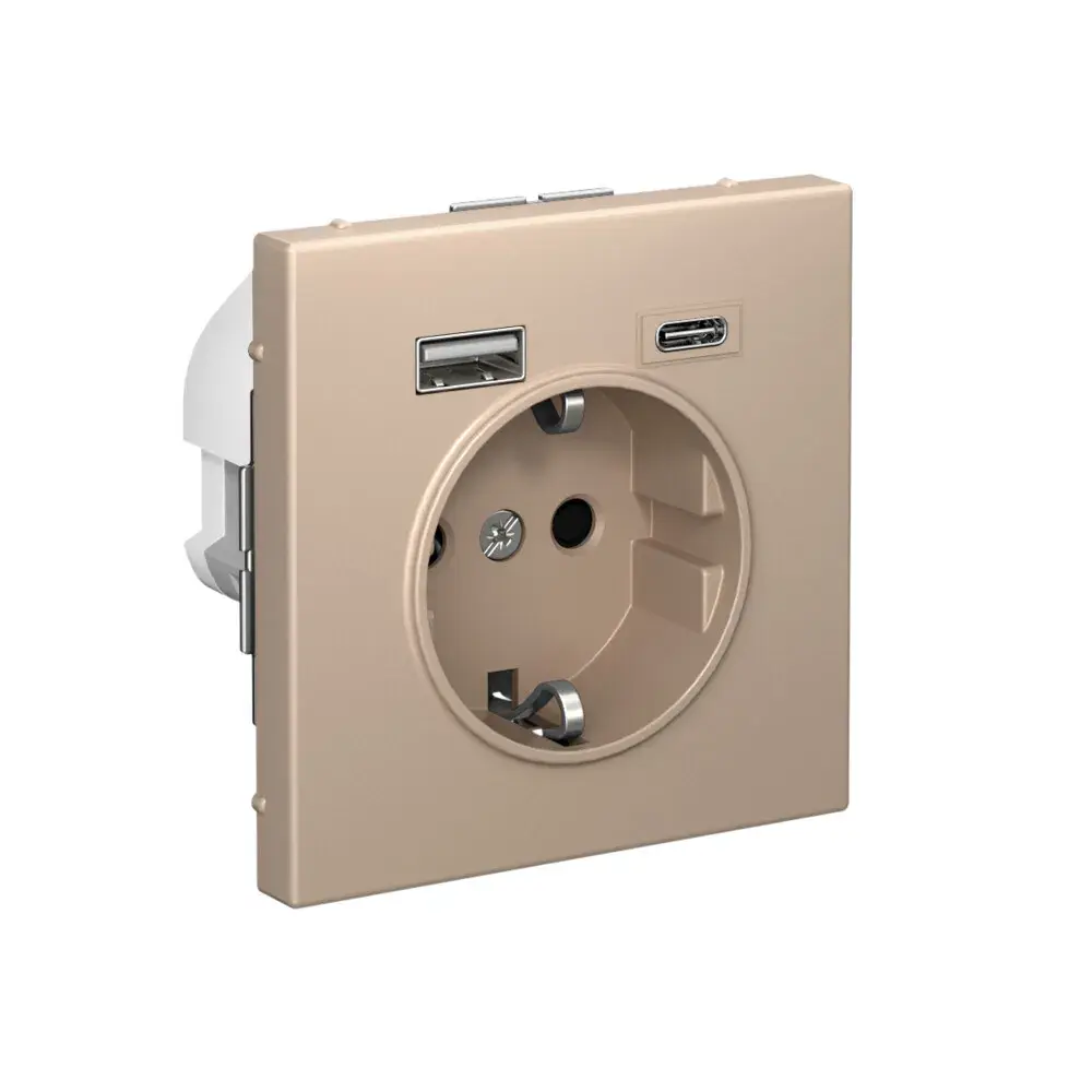 Розетка силовая Systeme Electric серии ArtGallery 16А в цвете песочный с заземлением и шторками с розеткой USB, с двумя разъемами тип А и тип С. Розетка совмещает в себе сразу 3 функции в одном изделии. Удобное и современное решение для дома, офиса и других помещений. Трендовый оттенок позволит удачно подчеркнуть стиль интерьера и правильно расставить акценты. Одно устройство позволяет как подключить бытовые приборы, так и зарядить мобильные устройства. Лучший промышленный дизайн (по итогам премии МИНПРОМТОРГ 2023).