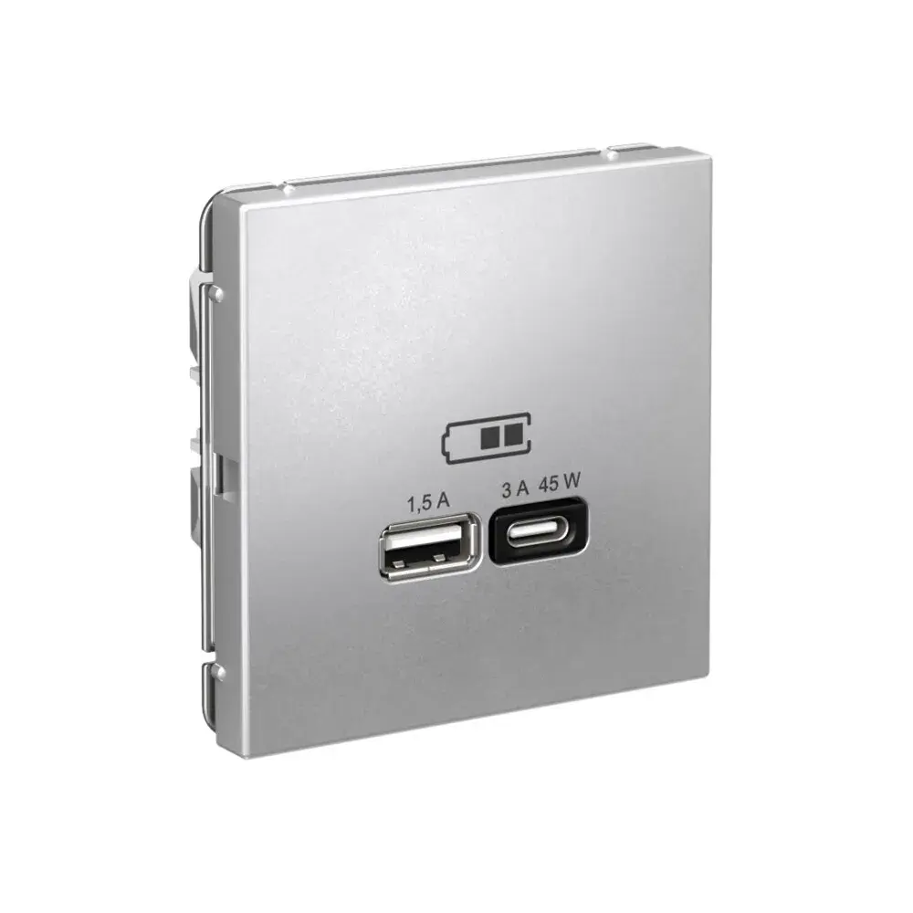 Розетка Systeme Electric серии ArtGallery в цвете алюминий двойная USB с разъемами типа A+C высокоскоростная. Классическое цветовое решение станет изюминкой любого интерьера. Самая современная USB-зарядка с двумя разъемами позволяет заряжать как стандартные мобильные устройства через разъем типа А, так и новейшие устройства с разъемом типа С. Мощность: тип-A – 7.5 Вт, тип-С 45Вт. Поддерживает современные протоколы быстрой зарядки QC, PD, последних версий. Лучший промышленный дизайн (по итогам премии МИНПРОМТОРГ 2023).