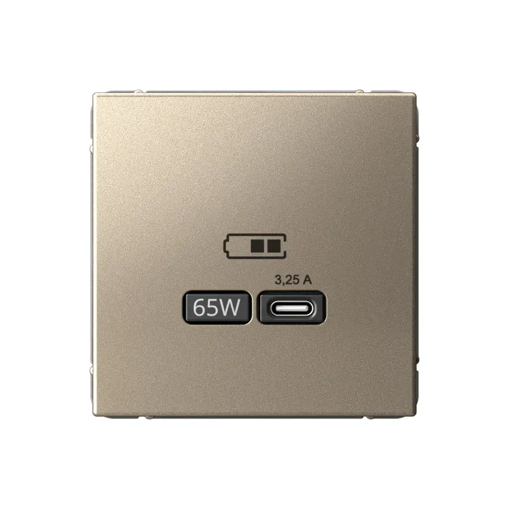 Розетка Systeme Electric серии ArtGallery в цвете шампань USB с разъемом типа C высокоскоростная. Классическое цветовое решение станет изюминкой любого интерьера. Самая современная USB-зарядка позволяет заряжать ноутбук, а также смартфоны последнего поколения, которые поддерживают функцию быстрой зарядки. Мощность: тип-С 65Вт. Поддерживает современные протоколы быстрой зарядки QC, PD, последних версий. Лицевые детали из качественного ABS-пластика, устойчивого к царапинам и УФ-излучению. Лучший промышленный дизайн (по итогам премии МИНПРОМТОРГ 2023).