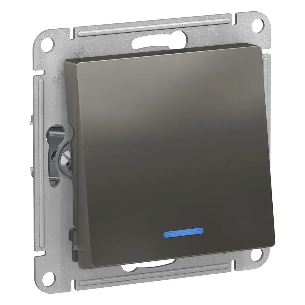 Механизм переключателя 1-клавишного с подсветкой Systeme Electric (ранее Schneider Electric) серии AtlasDesign в цвете сталь подходит для сетей 250 В, на ток 10 А. - Благодаря светодиодной подсветке синего цвета изделие легко найти в темноте. - Переключатель позволяют управлять одним источником света с двух точек. - Лицевые детали из качественного ABS-пластика, устойчивого к царапинам и УФ-излучению. - Усиленные прямые монтажные лапки для лучшей фиксации механизма в монтажной коробке.