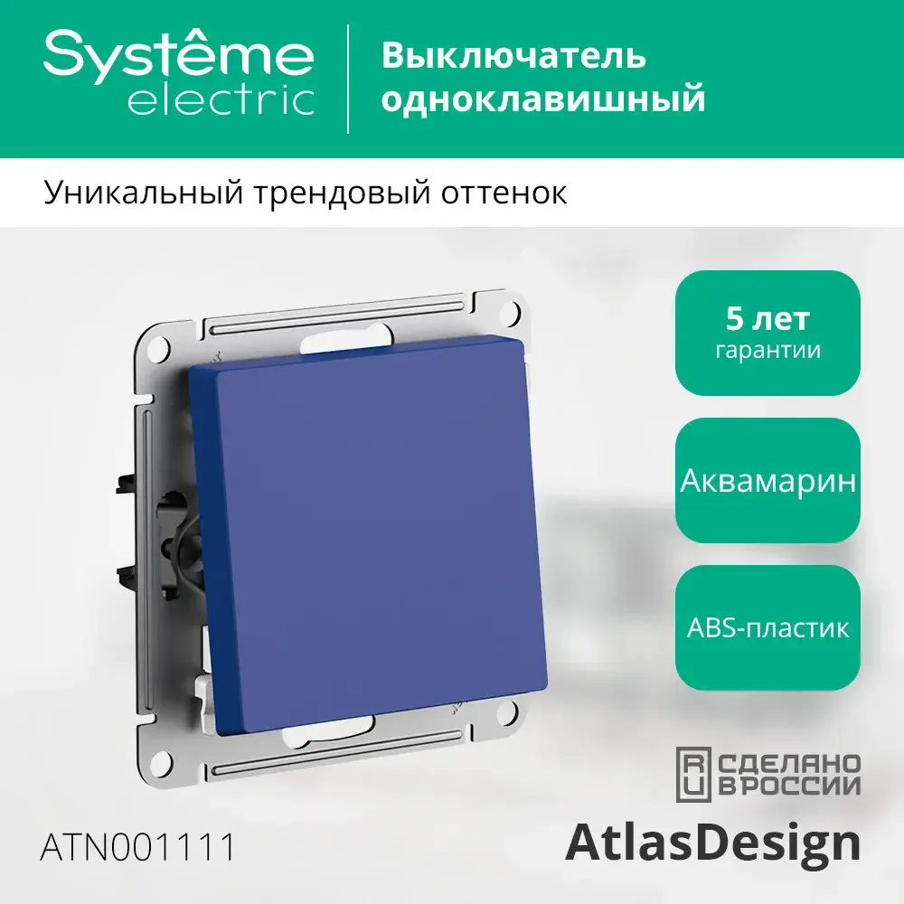 Механизм Systeme Electric (ранее Schneider Electric) серии AtlasDesign в цвете аквамарин выключателя 1-клавишного подходит для сетей 250 В, на ток 10 А. - Лицевые детали из качественного ABS-пластика, устойчивого к царапинам и УФ-излучению. - Усиленные прямые монтажные лапки для лучшей фиксации механизма в монтажной коробке.