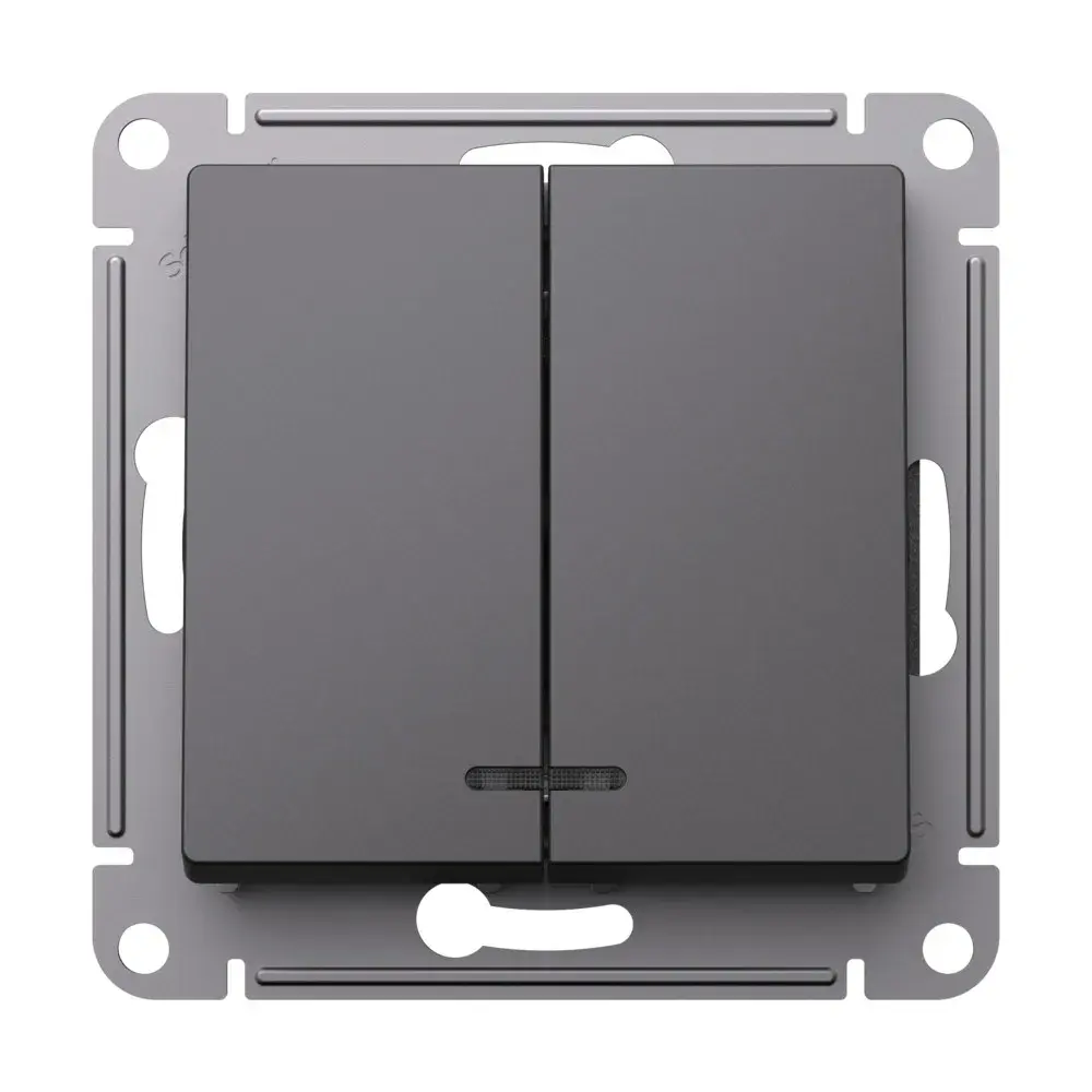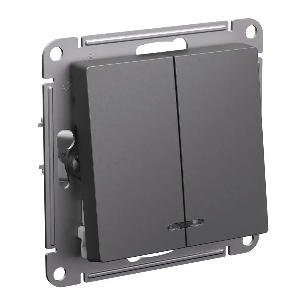 Механизм Systeme Electric (ранее Schneider Electric) серии AtlasDesign в цвете БАЗАЛЬТ выключателя 2-клавишного c подсветкой подходит для сетей 250 В, на ток 10 А. - Благодаря светодиодной подсветке синего цвета изделие легко найти в темноте. - Двухклавишный выключатель позволяет управлять двумя источниками света с одной точки. - Лицевые детали из качественного ABS-пластика, устойчивого к царапинам и УФ-излучению. - Усиленные прямые монтажные лапки для лучшей фиксации механизма в монтажной коробке.
