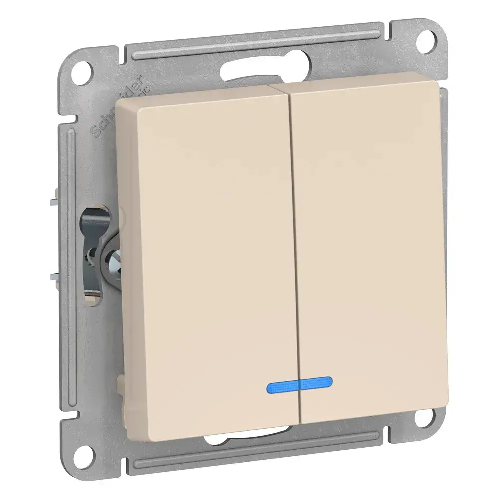 Механизм Systeme Electric (ранее Schneider Electric) серии AtlasDesign в бежевом цвете выключателя 2-клавишного c подсветкой подходит для сетей 250 В, на ток 10 А. - Благодаря светодиодной подсветке синего цвета изделие легко найти в темноте. - Двухклавишный выключатель позволяет управлять двумя источниками света с одной точки. - Лицевые детали из качественного ABS-пластика, устойчивого к царапинам и УФ-излучению. - Усиленные прямые монтажные лапки для лучшей фиксации механизма в монтажной коробке.