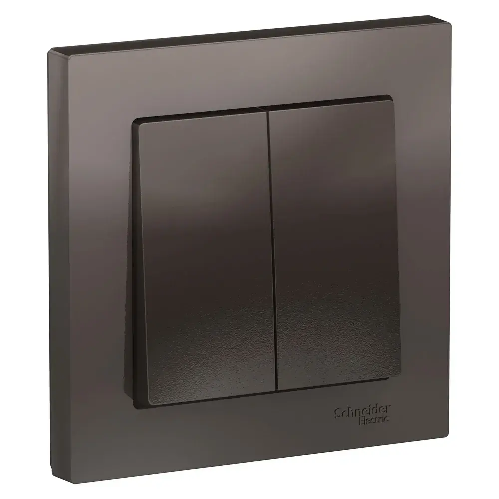 Выключатель Systeme Electric (ранее Schneider Electric) серии AtlasDesign (в сборе, цвет мокко) 2-клавишный подходит для сетей 250 В, на ток 10 А. - Двухклавишный выключатель позволяет управлять двумя источниками света с одной точки. - Лицевые детали из качественного ABS-пластика, устойчивого к царапинам и УФ-излучению. - Изделие поставляется в комплекте с рамкой того же цвета. - Усиленные прямые монтажные лапки для лучшей фиксации механизма в монтажной коробке.