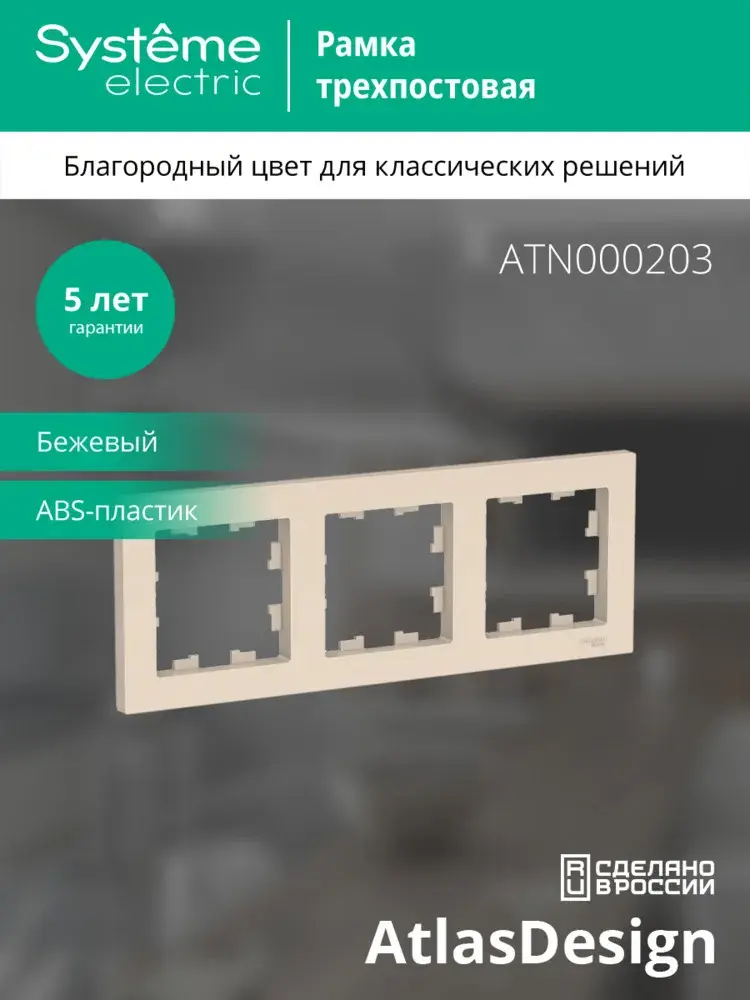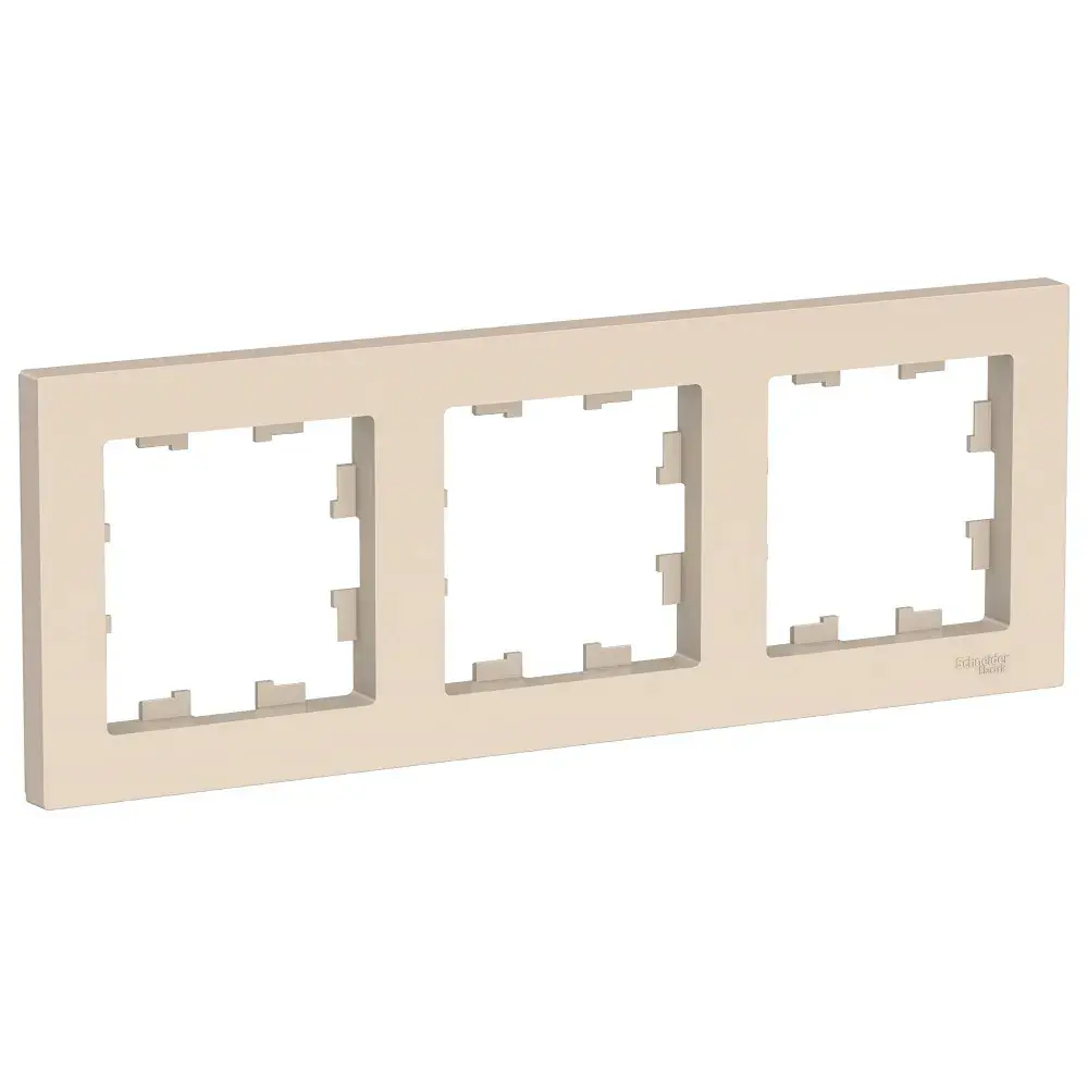 Рамка Systeme Electric (ранее Schneider Electric) серии AtlasDesign в бежевом цвете трёхместная. - Пластик с ионами серебра в белом цвете обеспечивает антибактериальный эффект. - Устанавливается в вертикальном и горизонтальном положениях. - Лицевые детали из качественного ABS-пластика, устойчивого к царапинам и УФ-излучению. - Позволяет гармонично вписать электроустановочное изделие в интерьер помещения.