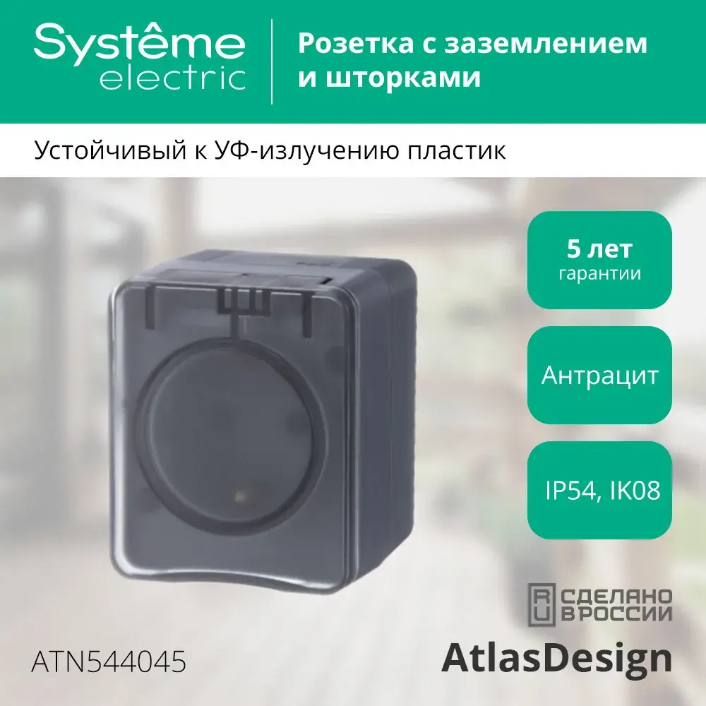 Розетка с заземлением со шторками для открытого монтажа, 16А, 250В. Степень защиты IP:54, Степень защиты IK: IK08. Продукция AtlasDesign Profi54 созданы специально для тех мест, где требуется повышенная защита от влаги и пыли. Уютная веранда в загородном доме, уличное кафе, любимый гараж или мастерская – выключатели и розетки будут обеспечивать надежную защиту и радовать глаз современным дизайном. Элегантный цвет антрацит гармонично впишется в любую обстановку.