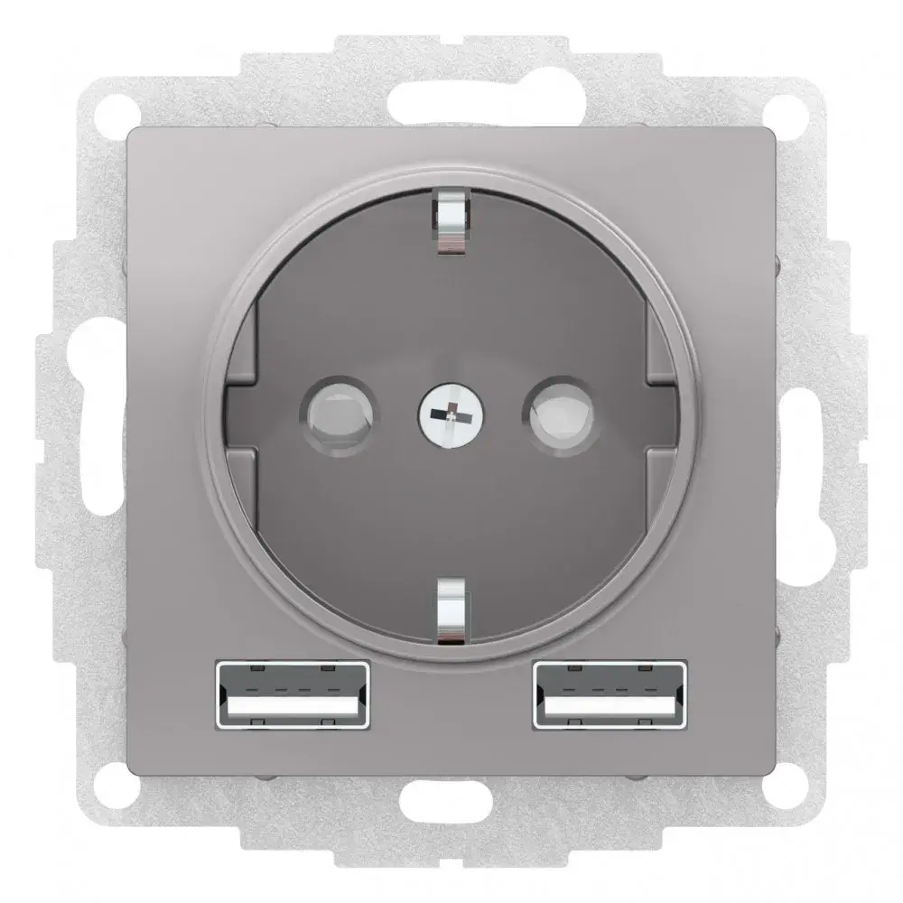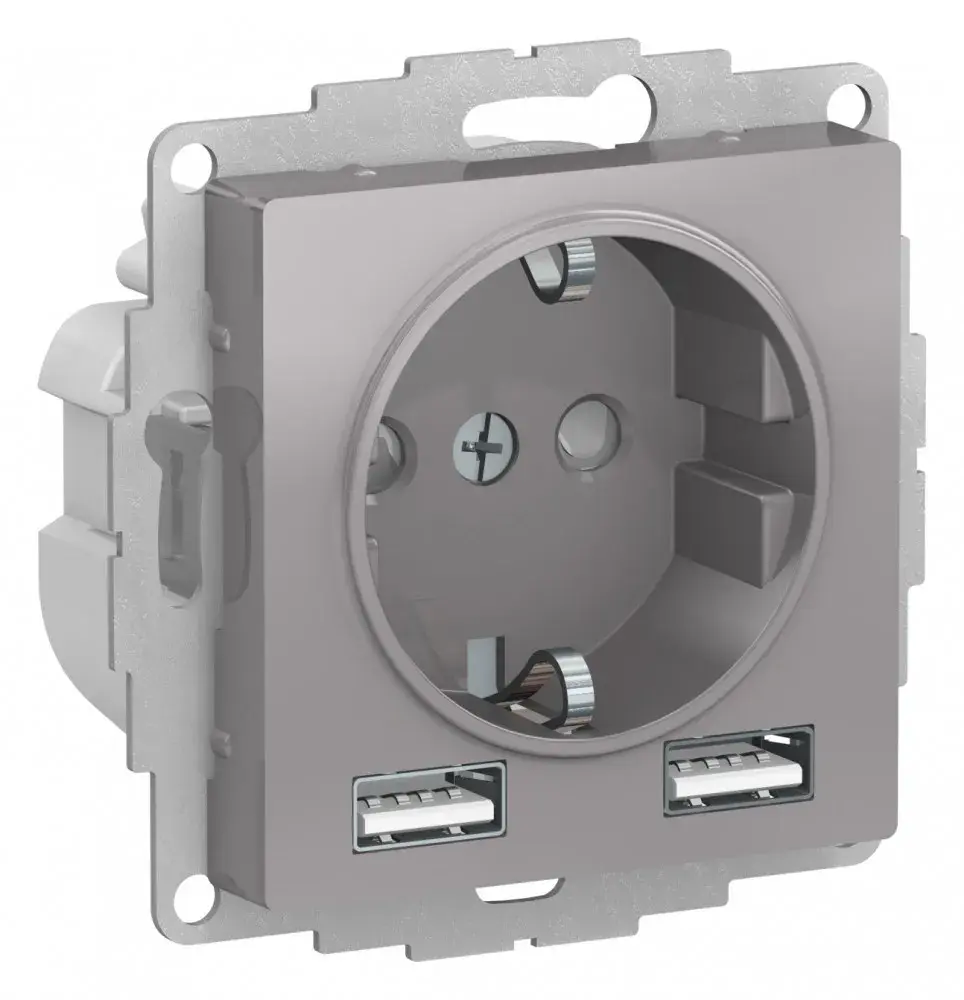 Розетка силовая Systeme Electric (ранее Schneider Electric) серии AtlasDesign 16А (цвет алюминий) с заземлением и шторками с розеткой USB, с друмя разъемами типа А - Лицевые детали из качественного ABS-пластика, устойчивого к царапинам и УФ-излучению. - Заземляющий контакт обеспечивает дополнительную защиту от удара электрическим током. - Шторки обеспечивают дополнительную безопасность в доме, где находятся дети. - Один механизм позволяет как подключить бытовые приборы, так и зарядить мобильные устройства.