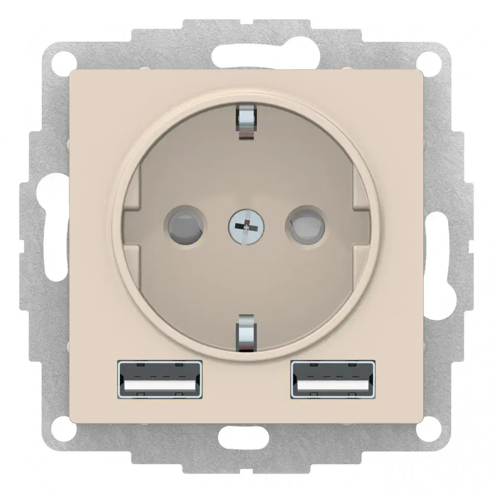 Розетка силовая Systeme Electric (ранее Schneider Electric) серии AtlasDesign 16А (цвет бежевый) с заземлением и шторками с розеткой USB, с друмя разъемами типа А - Лицевые детали из качественного ABS-пластика, устойчивого к царапинам и УФ-излучению. - Заземляющий контакт обеспечивает дополнительную защиту от удара электрическим током. - Шторки обеспечивают дополнительную безопасность в доме, где находятся дети. - Одно устройство позволяет как подключить бытовые приборы, так и зарядить мобильные устройства.
