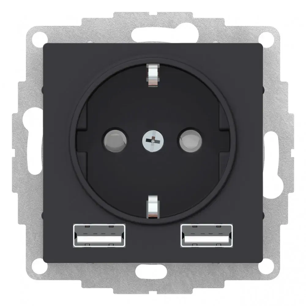 Розетка силовая Systeme Electric (ранее Schneider Electric) серии AtlasDesign 16А (цвет карбон) с заземлением и шторками с розеткой USB, с друмя разъемами типа А. - Лицевые детали из качественного ABS-пластика, устойчивого к царапинам и УФ-излучению. - Заземляющий контакт обеспечивает дополнительную защиту от удара электрическим током. - Шторки обеспечивают дополнительную безопасность в доме, где находятся дети. - Одно устройство позволяет как подключить бытовые приборы, так и зарядить мобильные устройства.