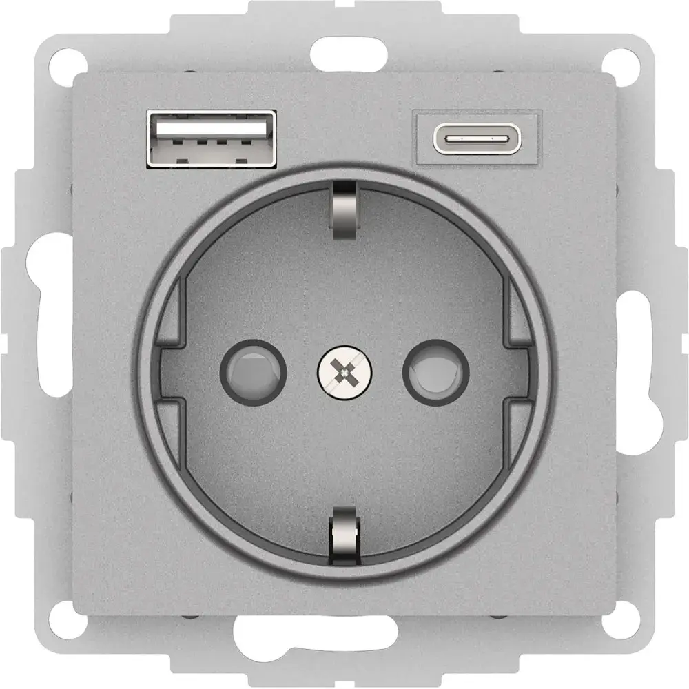 Розетка силовая Systeme Electric (ранее Schneider Electric) серии AtlasDesign 16А (цвет алюминий) с заземлением и шторками с розеткой USB, с двумя разъемами тип А и тип С. Розетка совмещает в себе сразу 3 функции в одном изделии. Удобное и современное решение для дома, офиса и других помещений. - Лицевые детали из качественного ABS-пластика, устойчивого к царапинам и УФ-излучению. - Заземляющий контакт обеспечивает дополнительную защиту от удара электрическим током. - Шторки обеспечивают дополнительную безопасность в доме, где находятся дети. - Одно устройство позволяет как подключить бытовые приборы, так и зарядить мобильные устройства.