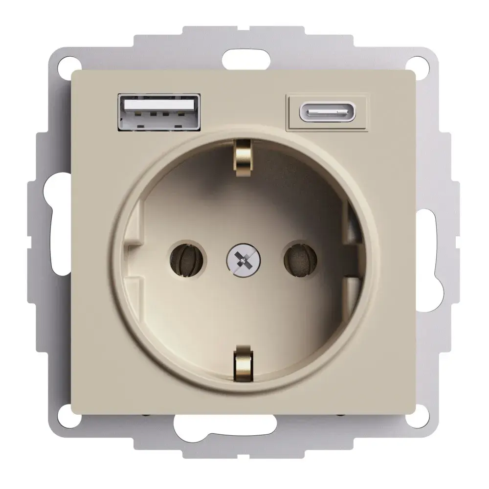 Розетка силовая Systeme Electric (ранее Schneider Electric) серии AtlasDesign 16А (цвет песочный) с заземлением и шторками с розеткой USB, с двумя разъемами тип А и тип С. Розетка совмещает в себе сразу 3 функции в одном изделии. Удобное и современное решение для дома, офиса и других помещений. Лицевые детали из качественного ABS-пластика, устойчивого к царапинам и УФ-излучению. Заземляющий контакт обеспечивает дополнительную защиту от удара электрическим током. Шторки обеспечивают дополнительную безопасность в доме, где находятся дети. Одно устройство позволяет как подключить бытовые приборы, так и зарядить мобильные устройства.