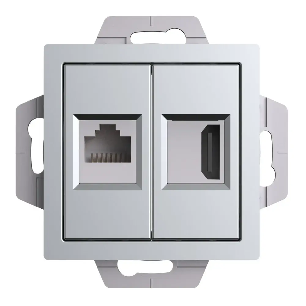 Механизм Systeme Electric (ранее Schneider Electric) серии AtlasDesign в цвете алюминий двойной розетки разъёмами RJ45 категория 5е и HDMI предназначен для удобного и быстрого подключения вашего компьютера и телевизора к соответствующим сетям. Лицевые детали из качественного ABS-пластика, устойчивого к царапинам и УФ-излучению. Усиленные прямые монтажные лапки для лучшей фиксации механизма в монтажной коробке.
