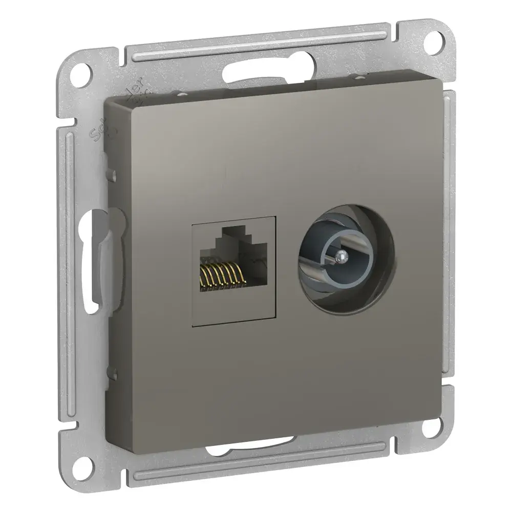 Механизм Systeme Electric (ранее Schneider Electric) серии AtlasDesign в цвете сталь двойной розетки разъёмами RJ45 категория 5е и TV предназначен для удобного и быстрого подключения вашего компьютера и телевизора к соответствующим сетям. - Лицевые детали из качественного ABS-пластика, устойчивого к царапинам и УФ-излучению. - Усиленные прямые монтажные лапки для лучшей фиксации механизма в монтажной коробке.