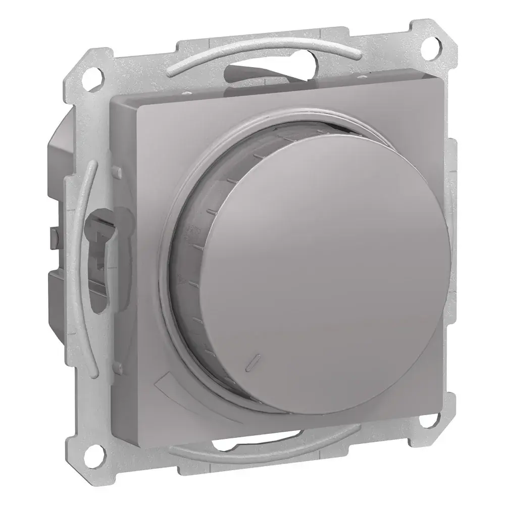 Механизм светорегулятора Systeme Electric (ранее Schneider Electric) серии AtlasDesign (цвет алюминий) поворотно-нажимной для нагрузки мощностью до 400 Вт, подходит для LED ламп. - Светорегулятор позволяет установить в помещении комфортный уровень освещения. - При подключении второго переключателя диммер может использоваться как проходной переключатель. - Может использоваться как выключатель или переключатель. - Выполнен из материала, стойкого к УФ-излучению и появлению царапин.