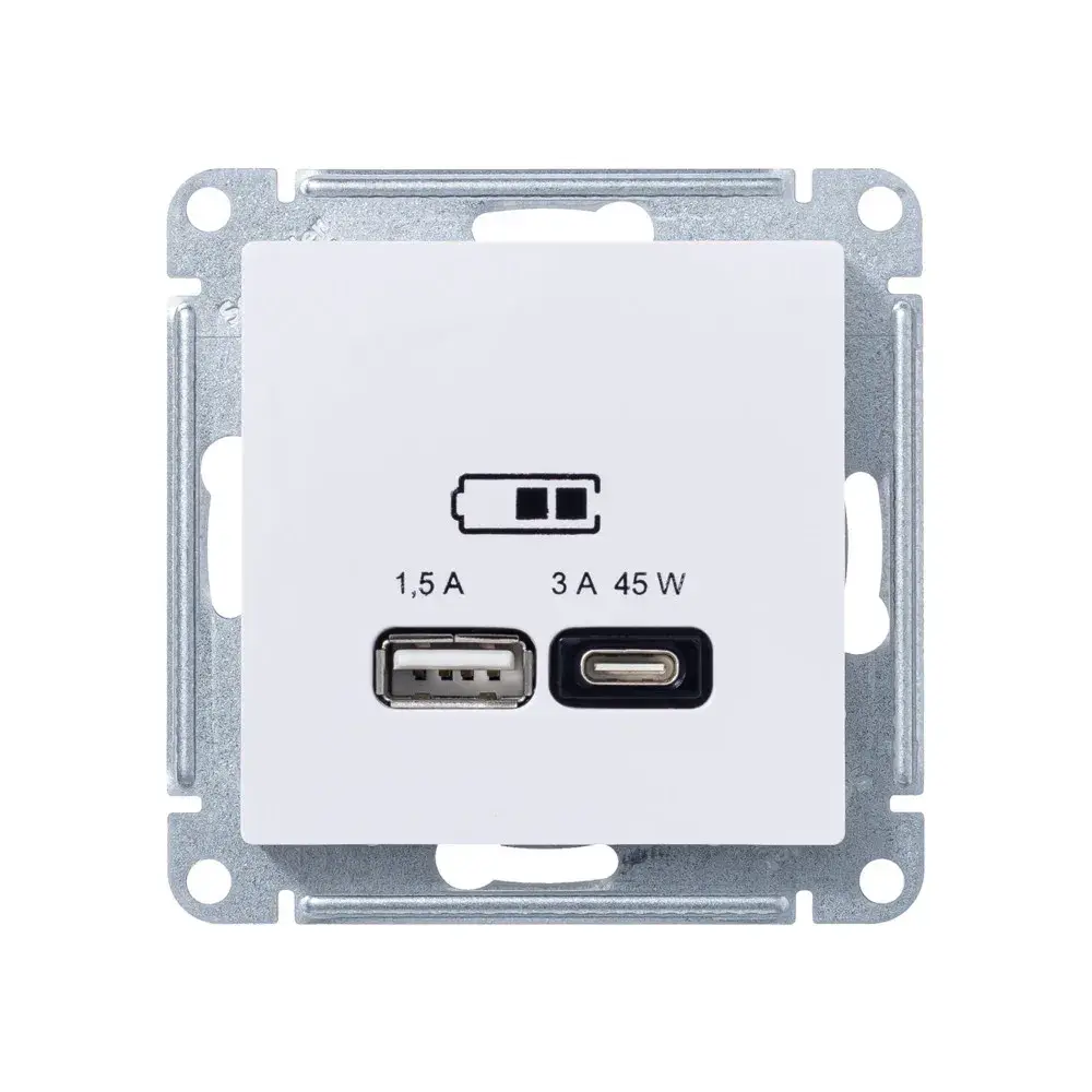 Розетка Systeme Electric (ранее Schneider Electric) серии AtlasDesign (цвет ЛОТОС) двойная USB с разъемами типа A+C высокоскоростная. - Самая современная USB-зарядка с двумя разъемами позволяет заряжать как стандартные мобильные устройства через разъем типа А, так и новейшие устройства с разъемом типа С. - Позволяет заряжать смартфоны последнего поколения, которые поддерживают функцию быстрой зарядки. - Мощность: тип-A – 7.5 Вт, тип-С - 45Вт. - Поддерживает современные протоколы быстрой зарядки QC, PD, последних версий. - Лицевые детали из качественного ABS-пластика, устойчивого к царапинам и УФ-излучению.