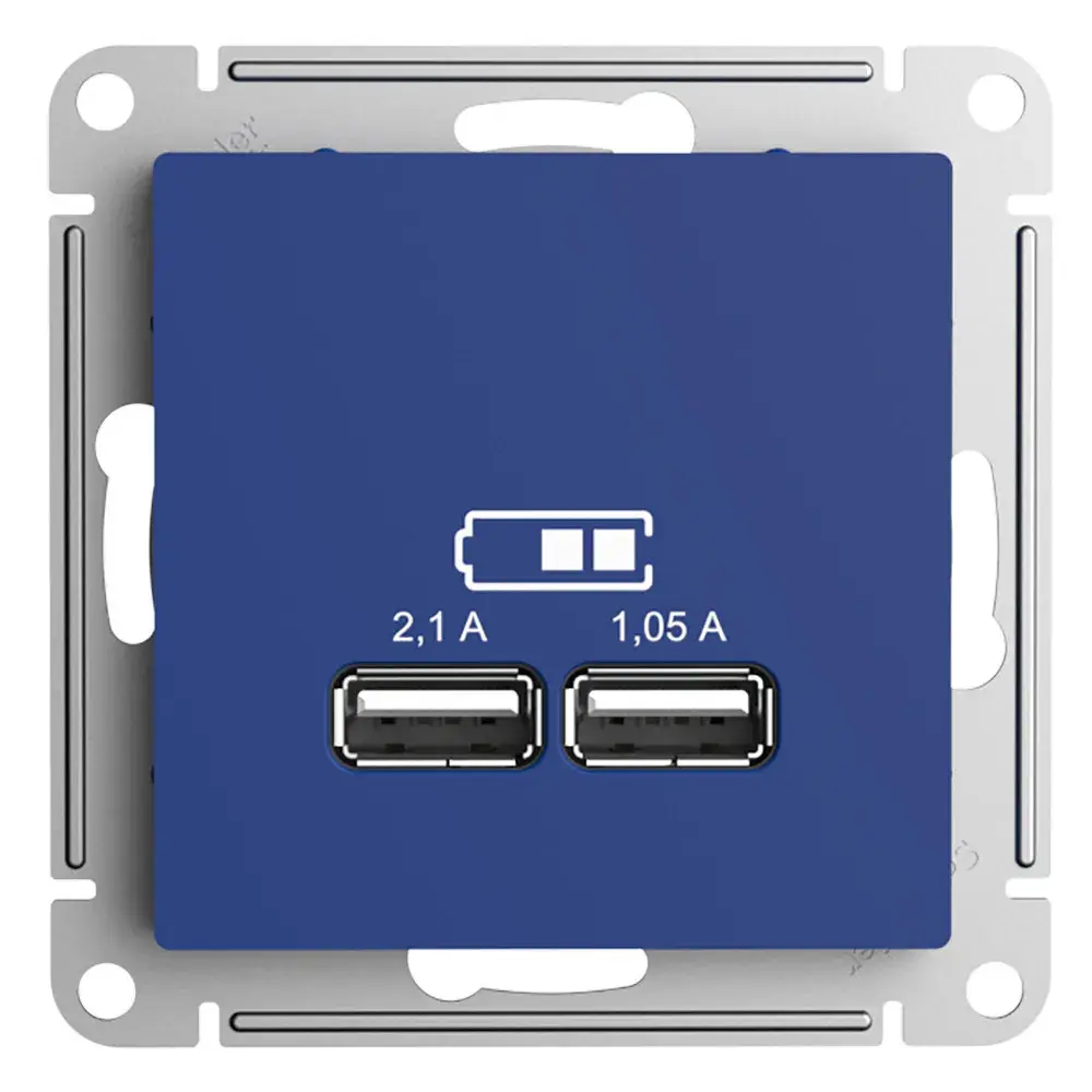 Механизм Systeme Electric (ранее Schneider Electric) серии AtlasDesign в цвете аквамарин розетки для зарядки с двумя разъёмами USB с выходными напряжением 5 В постоянного тока и выходами с номинальным током по 2,1 А. USB розетка позволяет напрямую заряжать одно или два мобильных устройства. Лицевые детали из качественного ABS-пластика, устойчивого к царапинам и УФ-излучению. Усиленные прямые монтажные лапки для лучшей фиксации механизма в монтажной коробке.