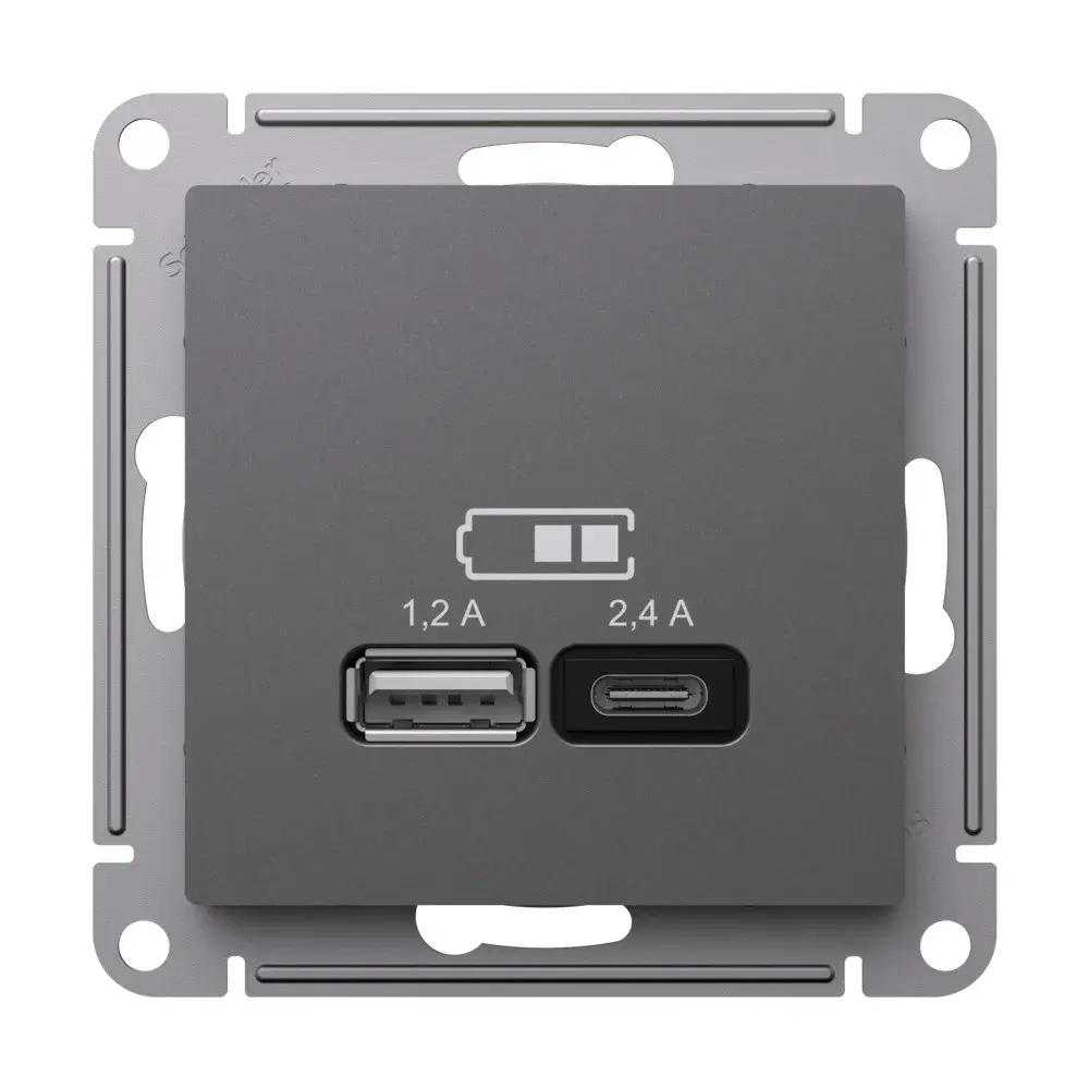 Розетка Systeme Electric (ранее Schneider Electric) серии AtlasDesign в цвете БАЗАЛЬТ двойная USB с разъемами типа A+C - Лицевые детали из качественного ABS-пластика, устойчивого к царапинам и УФ-излучению. - Самая современная USB-зарядка с двумя разъемами позволяет заряжать как стандартные мобильные устройства через разъем типа А, так и новейшии устройства, в том числе ноутбуки, с разъемом типа С.