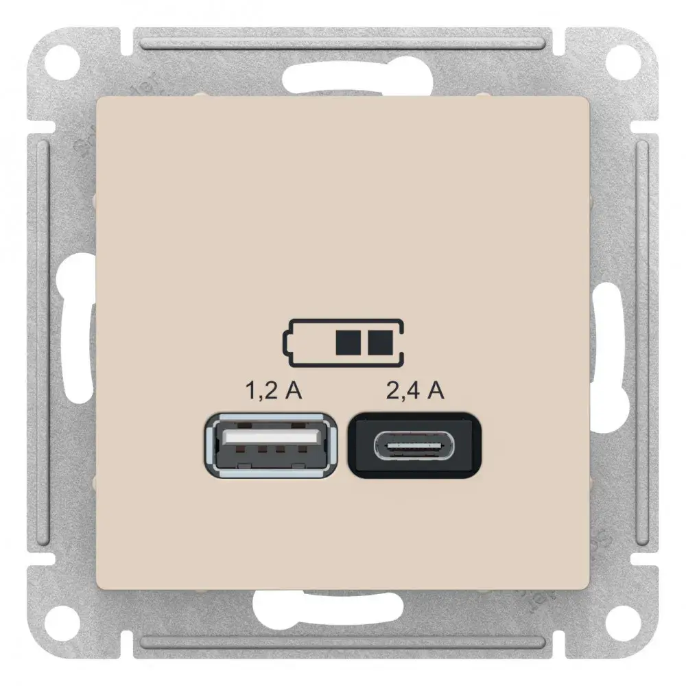 Розетка Systeme Electric (ранее Schneider Electric) серии AtlasDesign в бежевом цвете двойная USB с разъемами типа A+C - Лицевые детали из качественного ABS-пластика, устойчивого к царапинам и УФ-излучению. - Самая современная USB-зарядка с двумя разъемами позволяет заряжать как стандартные мобильные устройства через разъем типа А, так и новейшие устройства, в том числе ноутбуки, с разъемом типа С.