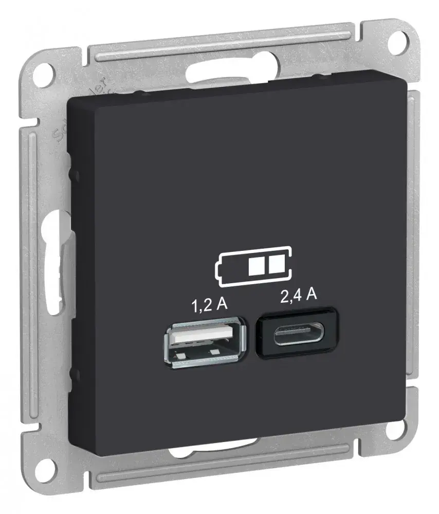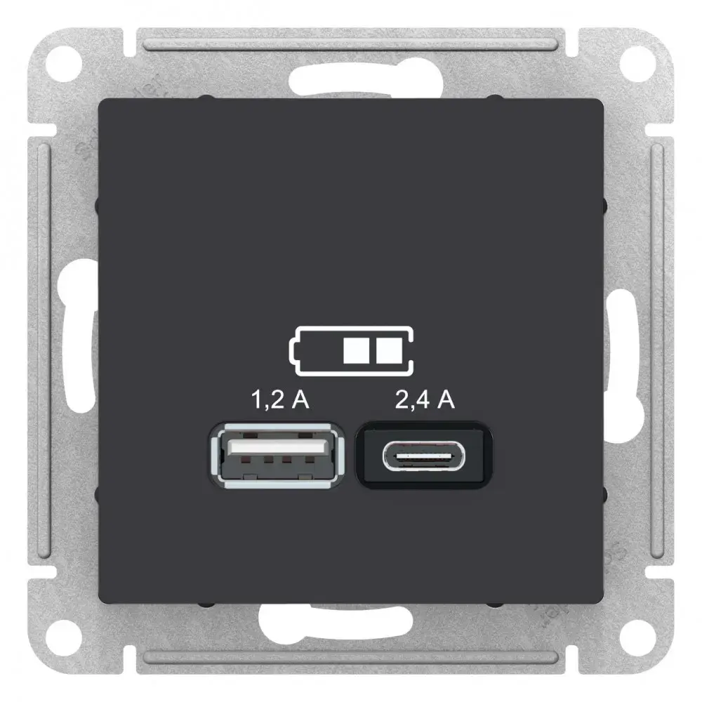 Розетка Systeme Electric (ранее Schneider Electric) серии AtlasDesign в цвете карбон двойная USB с разъемами типа A+C - Лицевые детали из качественного ABS-пластика, устойчивого к царапинам и УФ-излучению. - Самая современная USB-зарядка с двумя разъемами позволяет заряжать как стандартные мобильные устройства через разъем типа А, так и новейшии устройства, в том числе ноутбуки, с разъемом типа С.