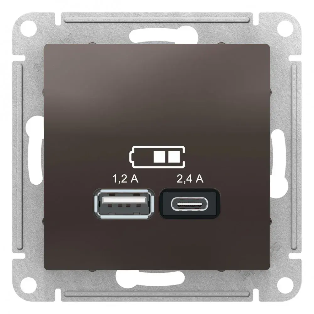 Розетка Systeme Electric (ранее Schneider Electric) серии AtlasDesign в цвете мокко двойная USB с разъемами типа A+C - Лицевые детали из качественного ABS-пластика, устойчивого к царапинам и УФ-излучению. - Самая современная USB-зарядка с двумя разъемами позволяет заряжать как стандартные мобильные устройства через разъем типа А, так и новейшие устройства, в том числе ноутбуки, с разъемом типа С.