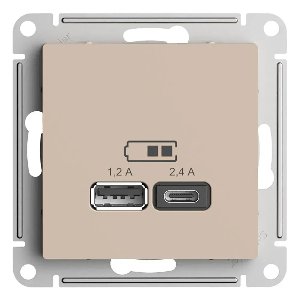 Розетка Systeme Electric (ранее Schneider Electric) серии AtlasDesign в цвете песочный двойная USB с разъемами типа A+C. Cовременная USB-зарядка с двумя разъемами позволяет заряжать как стандартные мобильные устройства через разъем типа А, так и новейшие устройства, в том числе ноутбуки, с разъемом типа С.