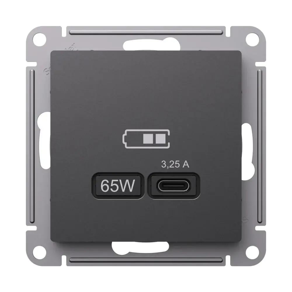 Розетка Systeme Electric (ранее Schneider Electric) серии AtlasDesign (цвет БАЗАЛЬТ) USB с разъемом типа C высокоскоростная. - Самая современная USB-зарядка позволяет заряжать ноутбук, а также смартфоны последнего поколения, которые поддерживают функцию быстрой зарядки. - Мощность: тип-С - 65Вт. - Поддерживает современные протоколы быстрой зарядки QC, PD, последних версий. - Лицевые детали из качественного ABS-пластика, устойчивого к царапинам и УФ-излучению.
