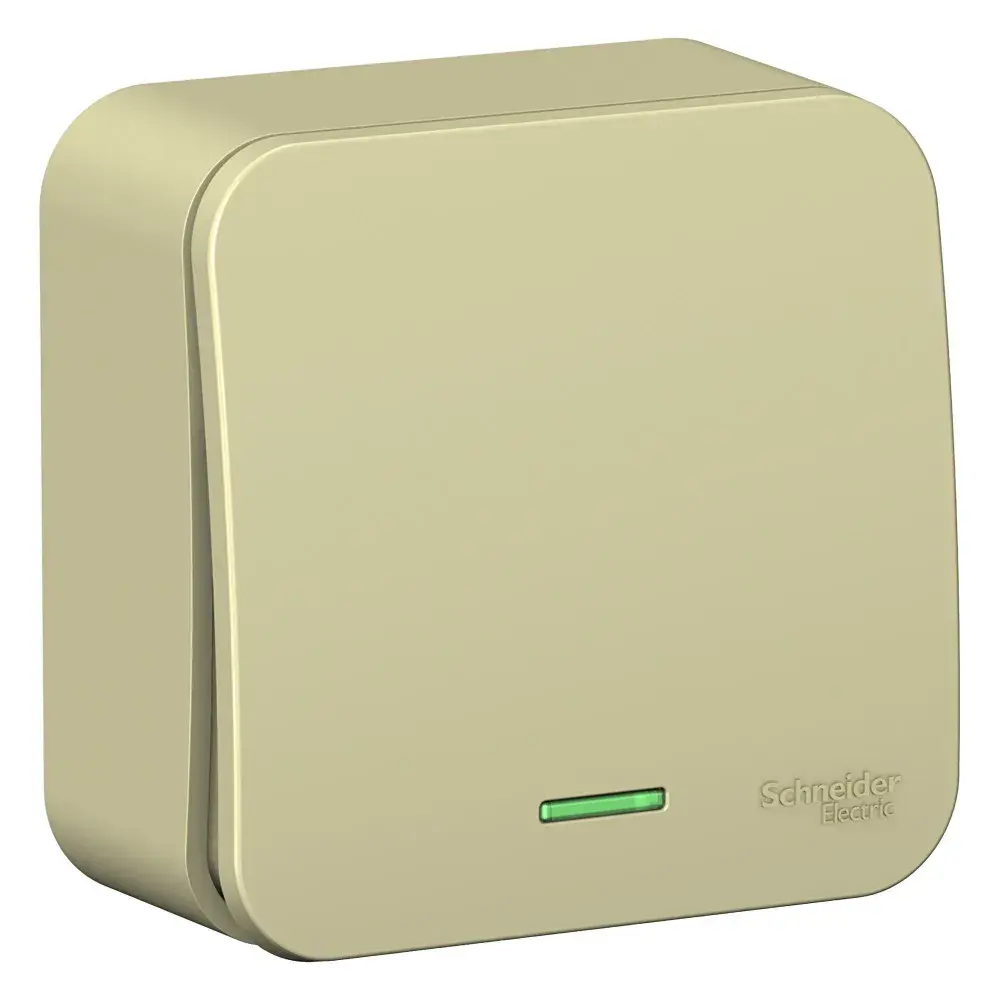 Выключатель одноклавишный Systeme Electric (ранее Schneider Electric) BLANCA (открытой установки, цвет бежевый) с изолирующей пластиковой пластиной и подсветкой предназначен для сетей до 250 В, на ток до 10 А. - Благодаря светодиодной подсветке зеленого цвета изделие легко найти в темноте. -Корпус изделия выполнен из ABS-пластика. - Увеличенная площадь контактной поверхности гарантирует надежность и качество соединения, исключая потери.