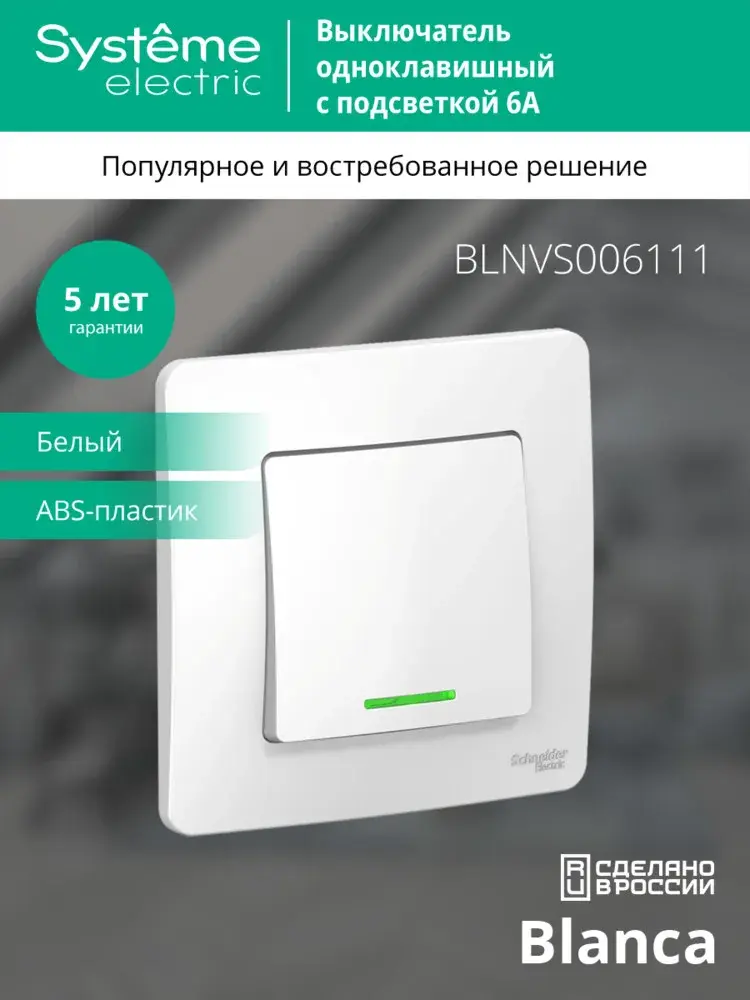 <div class="_truncate" data-v-566031d2><p>Выключатель Systeme Electric (ранее Schneider Electric) BLANCA (белый, скрытой установки) одноклавишный предназначен для сетей до 250В, на ток до 6А. Подсветка делает его легко находимым в отсутствие освещения. Выключатель подходит для небольших светильников и бра.</p></div> <button class="catalog-item__text-btn" data-v-566031d2><span data-v-566031d2>Подробнее</span></button> <div tabindex="-1" class="resize-observer" data-v-8859cc6c data-v-566031d2></div>