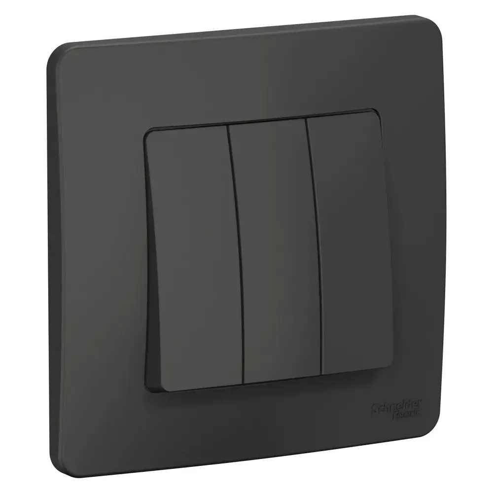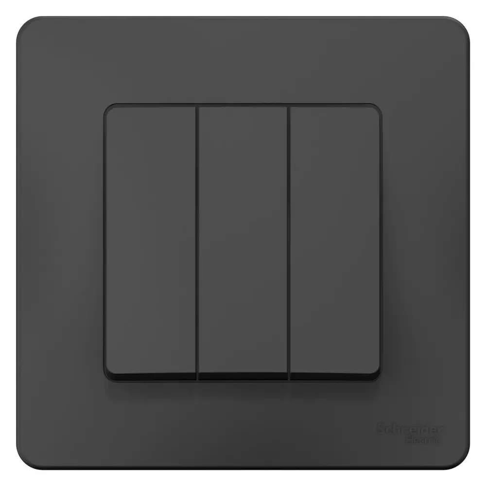 Выключатель Systeme Electric(ранееSchneider Electric) BLANCA (антрацит, скрытой установки) трехклавишный предназначен для сетей до 250В, на ток до 10А. Трехклавишный выключатель позволяет управлять тремя источниками света из одной точки.