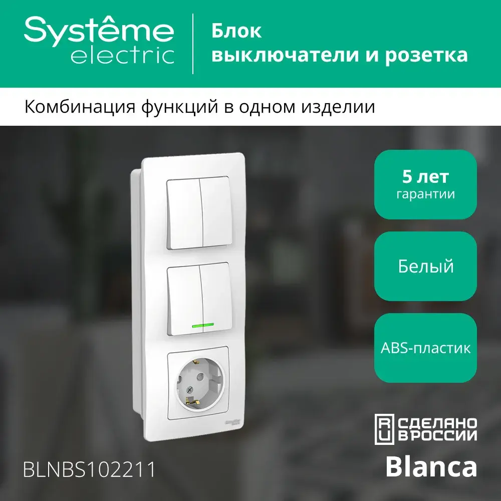 <div class="_truncate" data-v-566031d2><p>Блок Systeme Electric (ранее Schneider Electric) BLANCA (белый, скрытой установки) предназначен для сетей до 250В, состоит из розетки на 16А с заземлением и шторками и двух двухклавишных выключателей на 10А, один из которых с подсветкой, что делает его легко находимым в отсутствие освещения. Блок удобен в применении и отлично подходит для коридора.</p></div> <button class="catalog-item__text-btn" data-v-566031d2><span data-v-566031d2>Подробнее</span></button> <div tabindex="-1" class="resize-observer" data-v-8859cc6c data-v-566031d2></div>