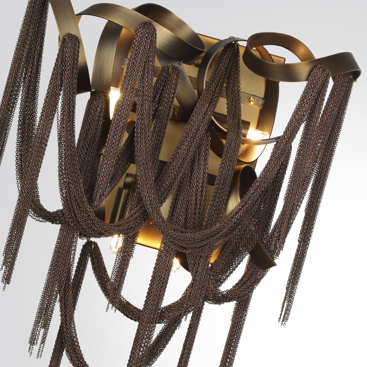Коллекция Chainy — это люстровая линия в неоклассическом стиле коричневого цвета. Основу дизайна люстр составляют множество цепочек глубокого шоколадного оттенка, которые образуют элегантные провисы и создают красивую единую композицию. Красивое сочетание металлического каркаса в гальваническом брашированном исполнении коричневого цвета и цепочек позволяют использовать светильники как световые акценты в неоклассических интерьерах теплых светлых оттенков, которые сейчас невероятно актуальны. В линии 2 круглых и 1 горизонтальная люстра и бра.Светильники станут великолепным акцентом в неоклассических интерьерах.
