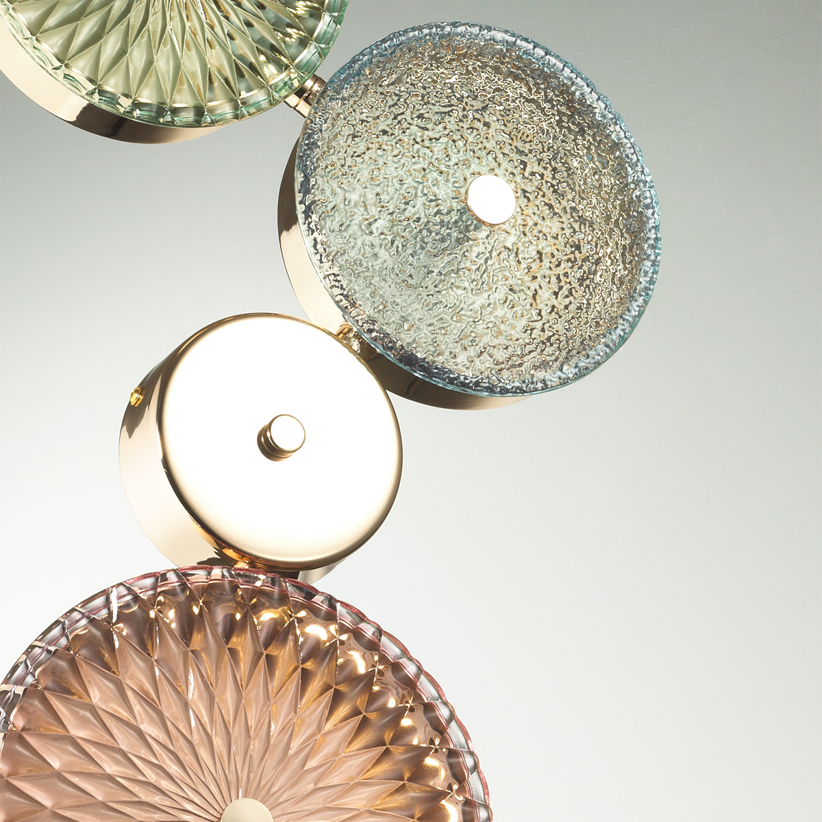 Линия светильников Caramella получила своё название благодаря сходству с карамельными конфетами. В ней сочетаются стекло нежных пастельных оттенков, золотой металл, разнообразные паттерны стёкол и современный LED источник света. Светильники Caramella прекрасно впишутся как в современные, так и в классические интерьеры, благодаря своему изящнуму дизайну. Из подвесных и настенных светильников линии можно создавать разнообразные композиции, внося в интерьер уникальыне акценты.
