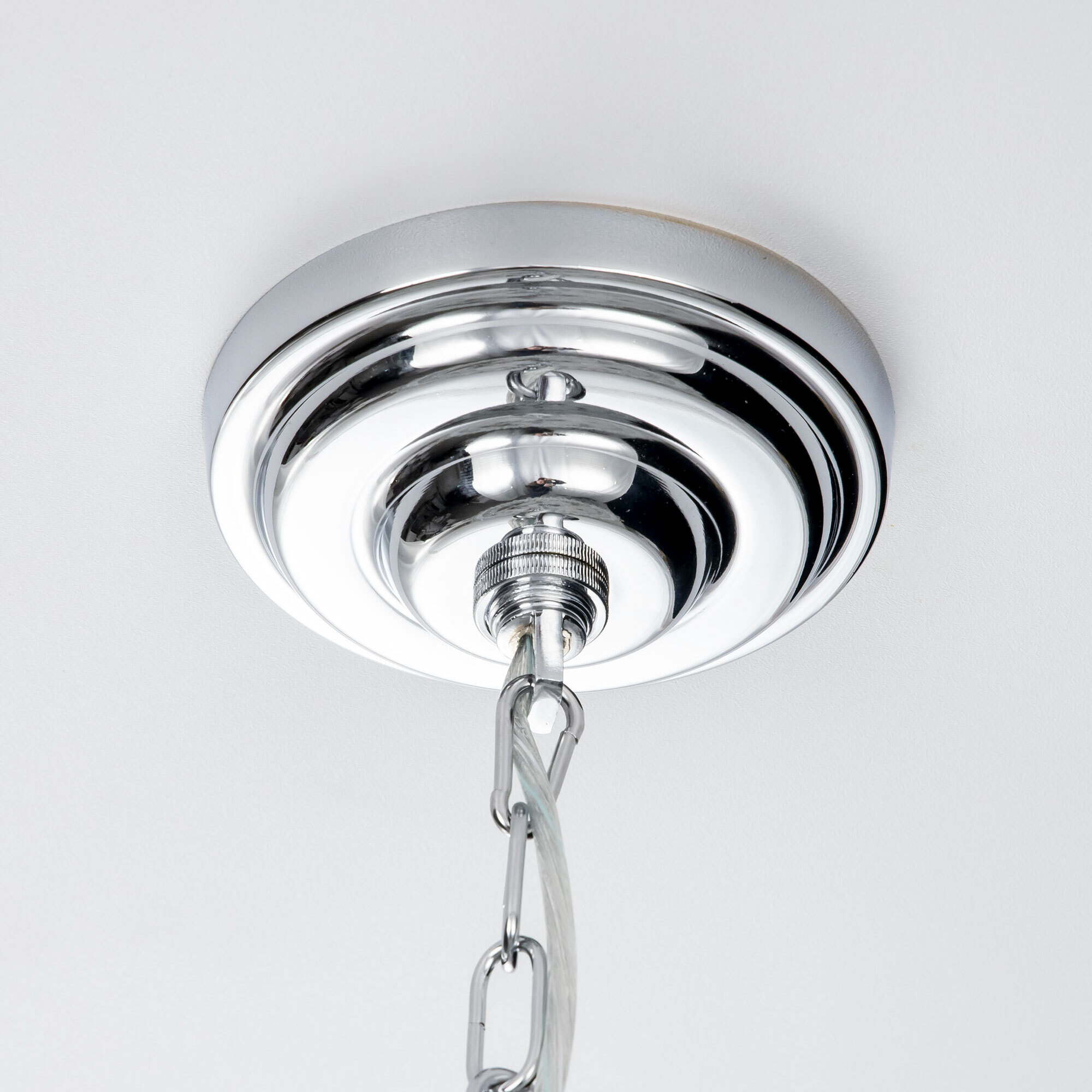 В изделии 6 ламп с цоколем Е14 максимальной мощностью для ламп накаливания 60Вт (в комплект не входят, приобретаются отдельно). Люстра подходит для общего и дополнительного освещения помещений как с высокими, так и с низкими потолками, длина цепи регулируется при установке, тип крепления – планка. Диаметр модели 47,5см, высота 45-110см, осветит до 21м².
