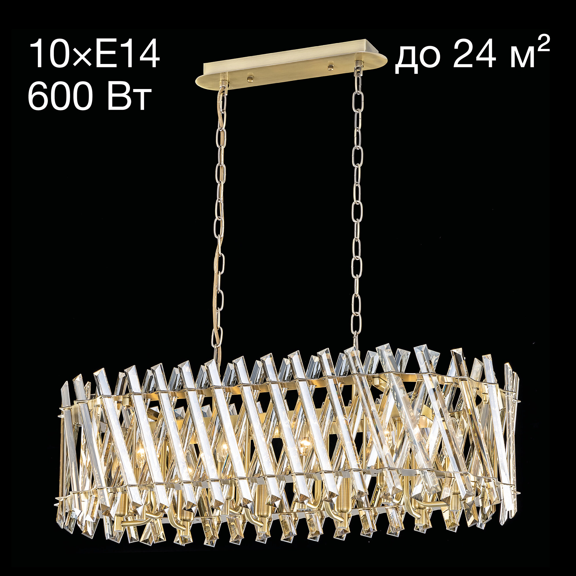 В изделии 10 ламп с цоколем Е14, максимальной мощностью для ламп накаливания 60Вт (в комплект не входят, приобретаются отдельно). Люстра подходит для общего и дополнительного освещения помещений как с высокими, так и с низкими потолками, длина цепи регулируется при установке, тип крепления – планка. Размеры модели - длина 81см, ширина 36см, высота 45-140см, осветит до 24м².