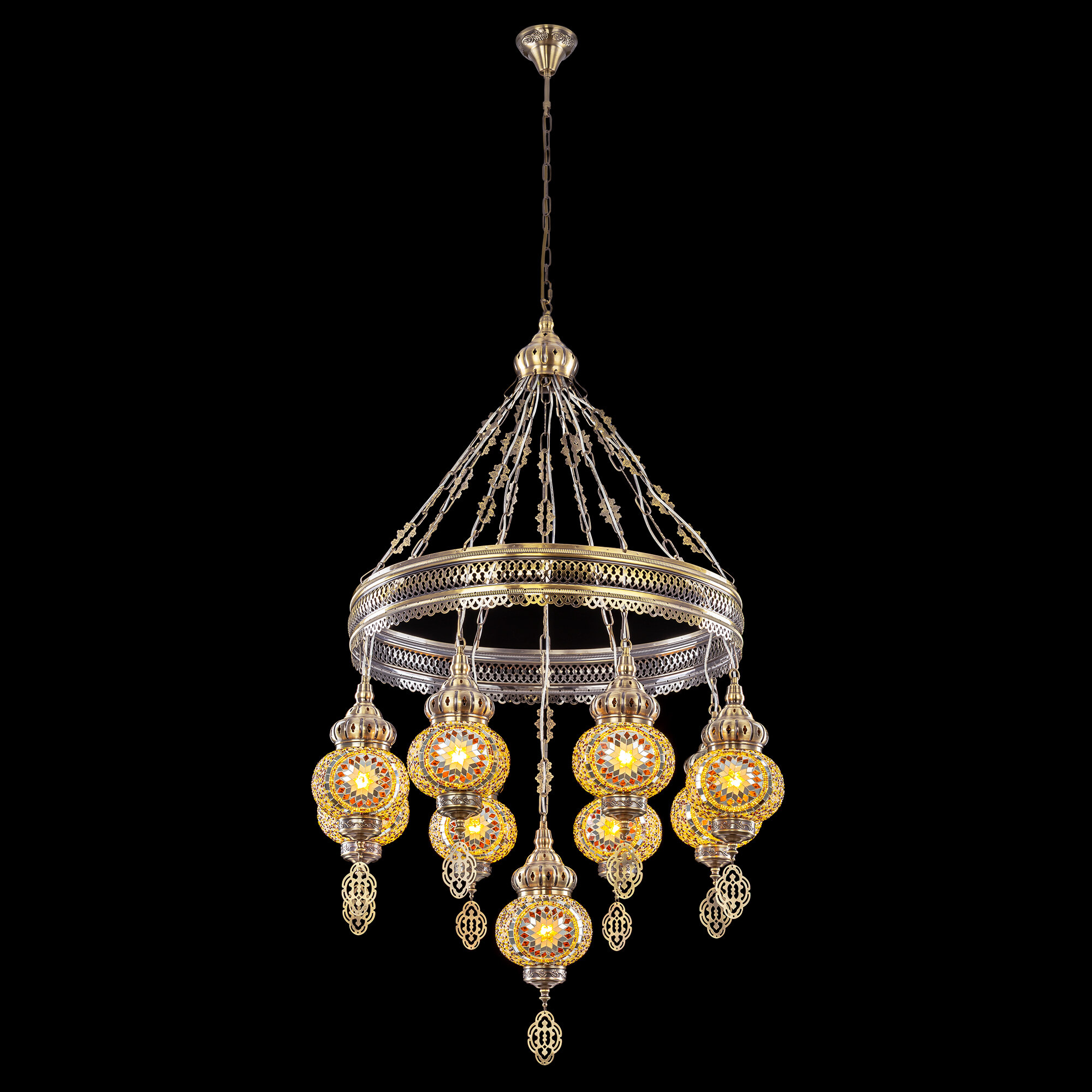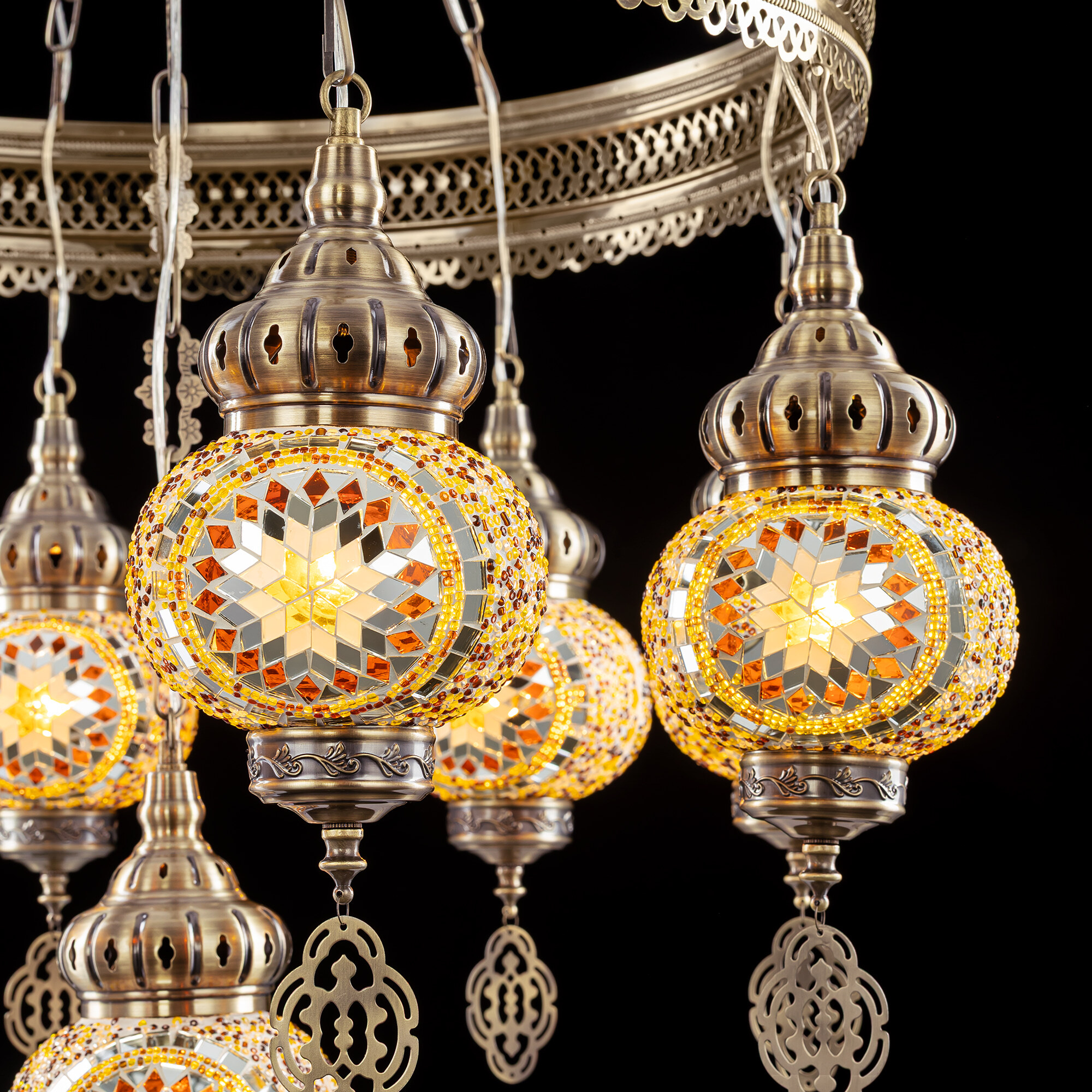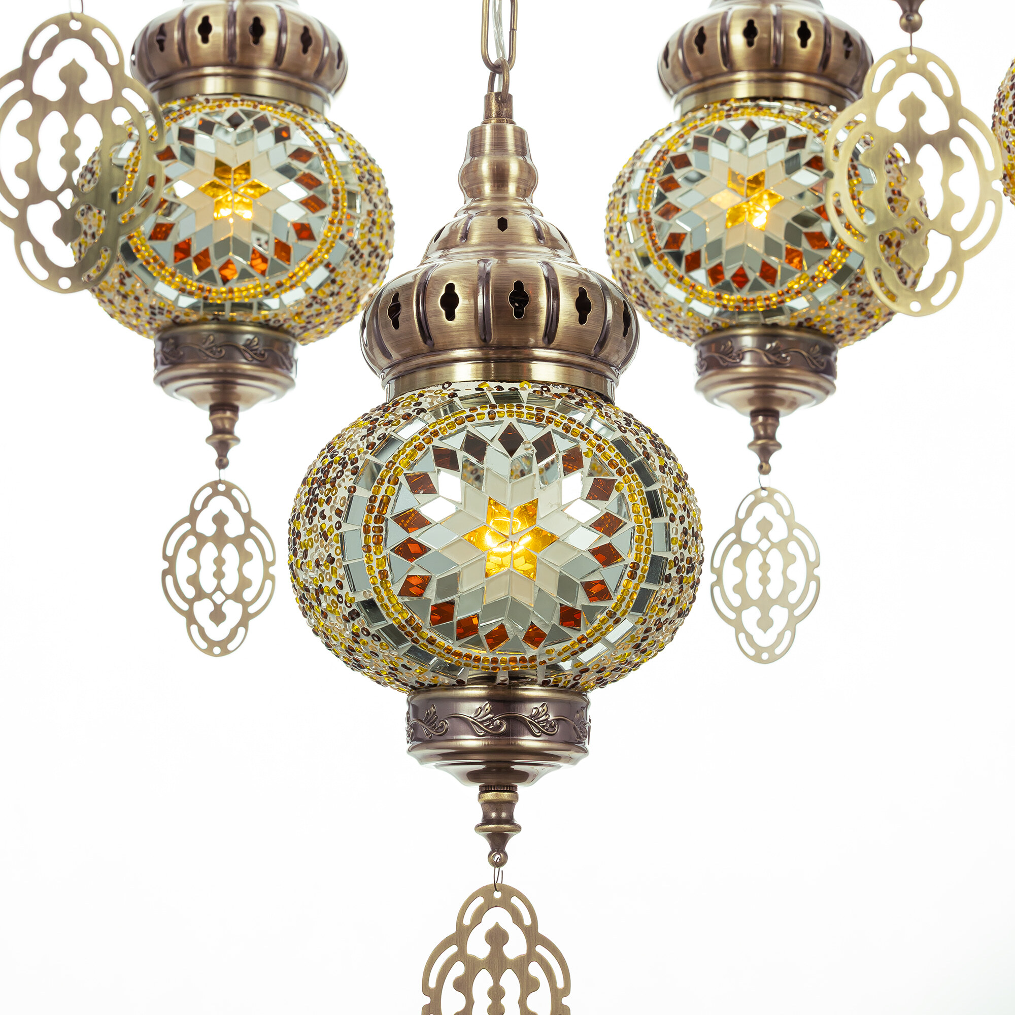 Девять подвесных плафонов, выполненных в форме слегка приплюснутых шаров, словно капли меда, застывшие в воздухе. Стеклянная мозаика в оттенках янтаря наполняет пространство теплым, уютным свечением. Металлический каркас благородного бронзового цвета декорирован искусной чеканкой.