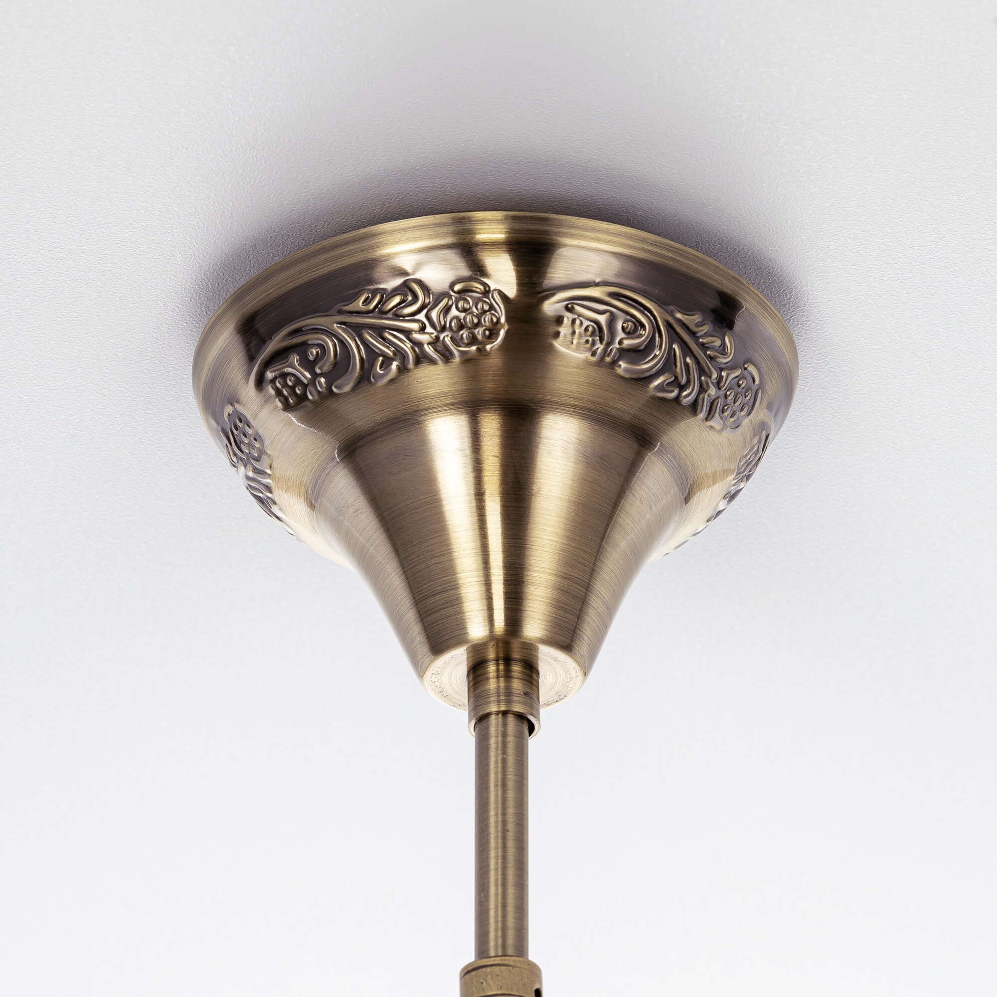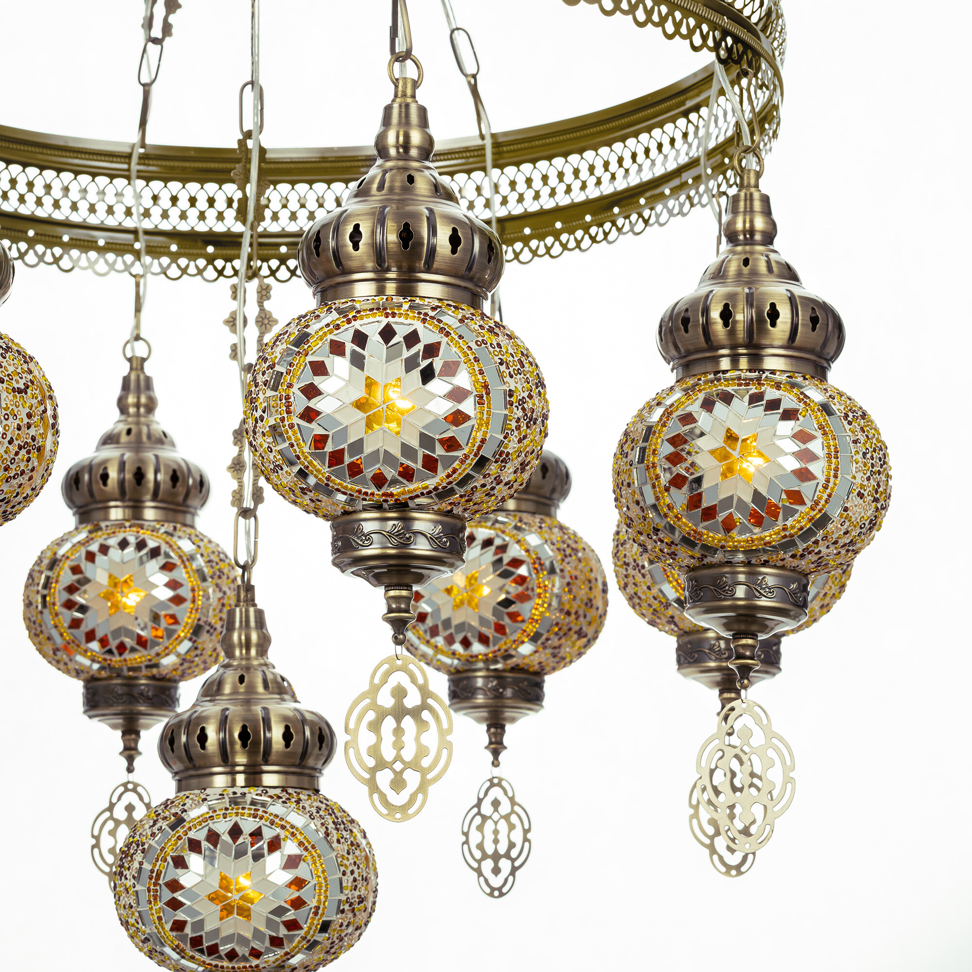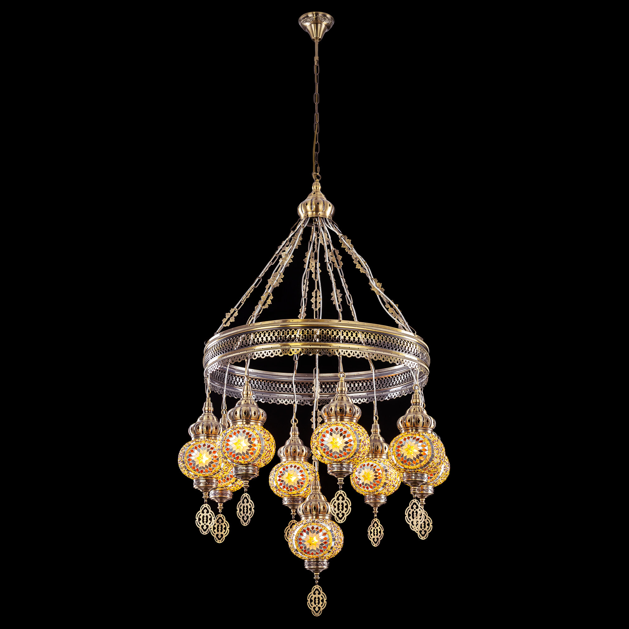 Девять подвесных плафонов, выполненных в форме слегка приплюснутых шаров, словно капли меда, застывшие в воздухе. Стеклянная мозаика в оттенках янтаря наполняет пространство теплым, уютным свечением. Металлический каркас благородного бронзового цвета декорирован искусной чеканкой.