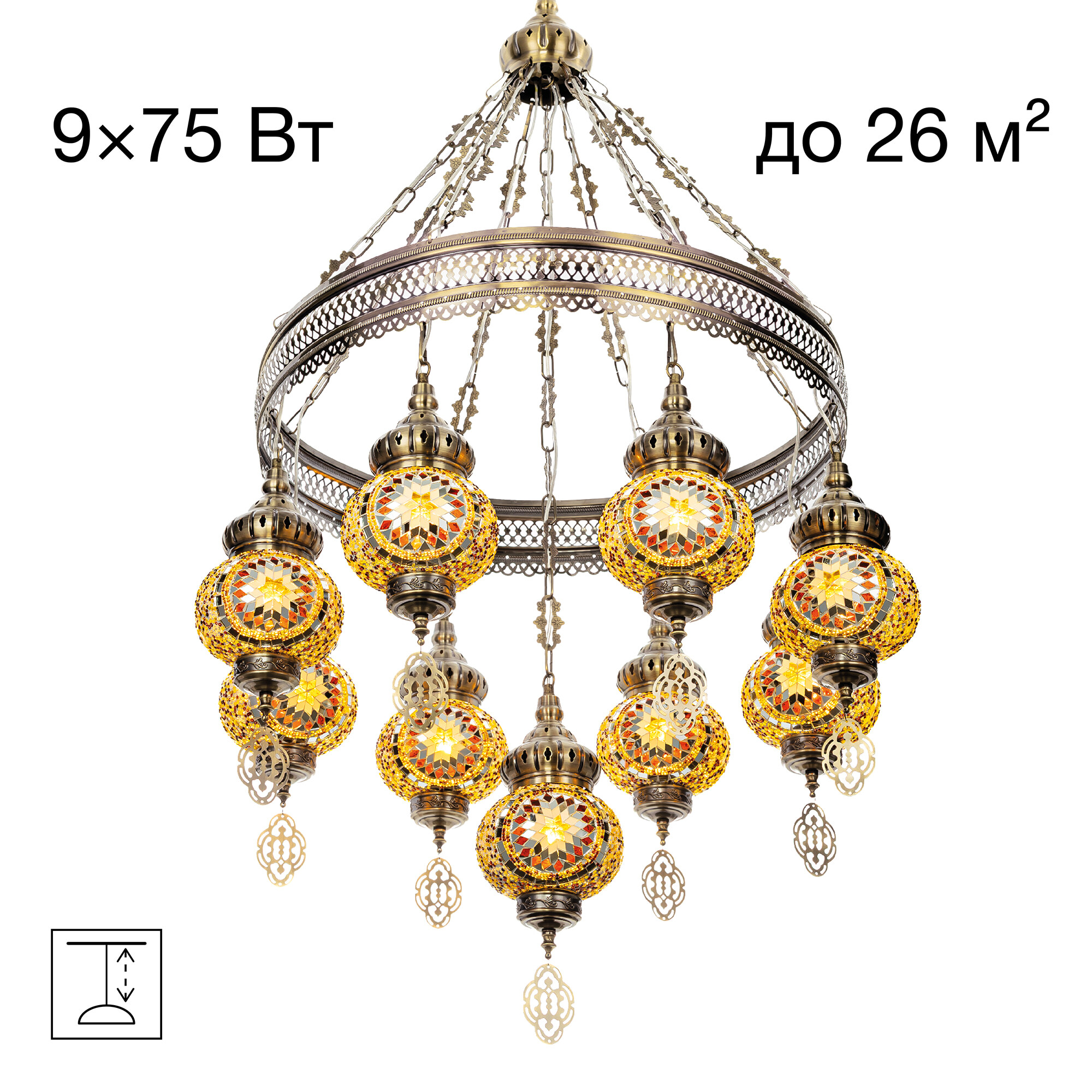 В изделии используются 9 ламп с цоколем Е27, максимальной мощностью для ламп накаливания 75Вт. Универсальное крепление на крючок делает люстру идеальной для любых типов потолков, включая натяжные.