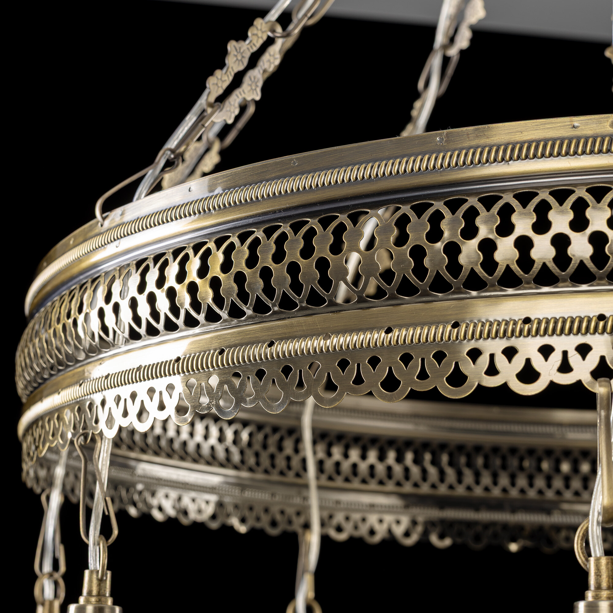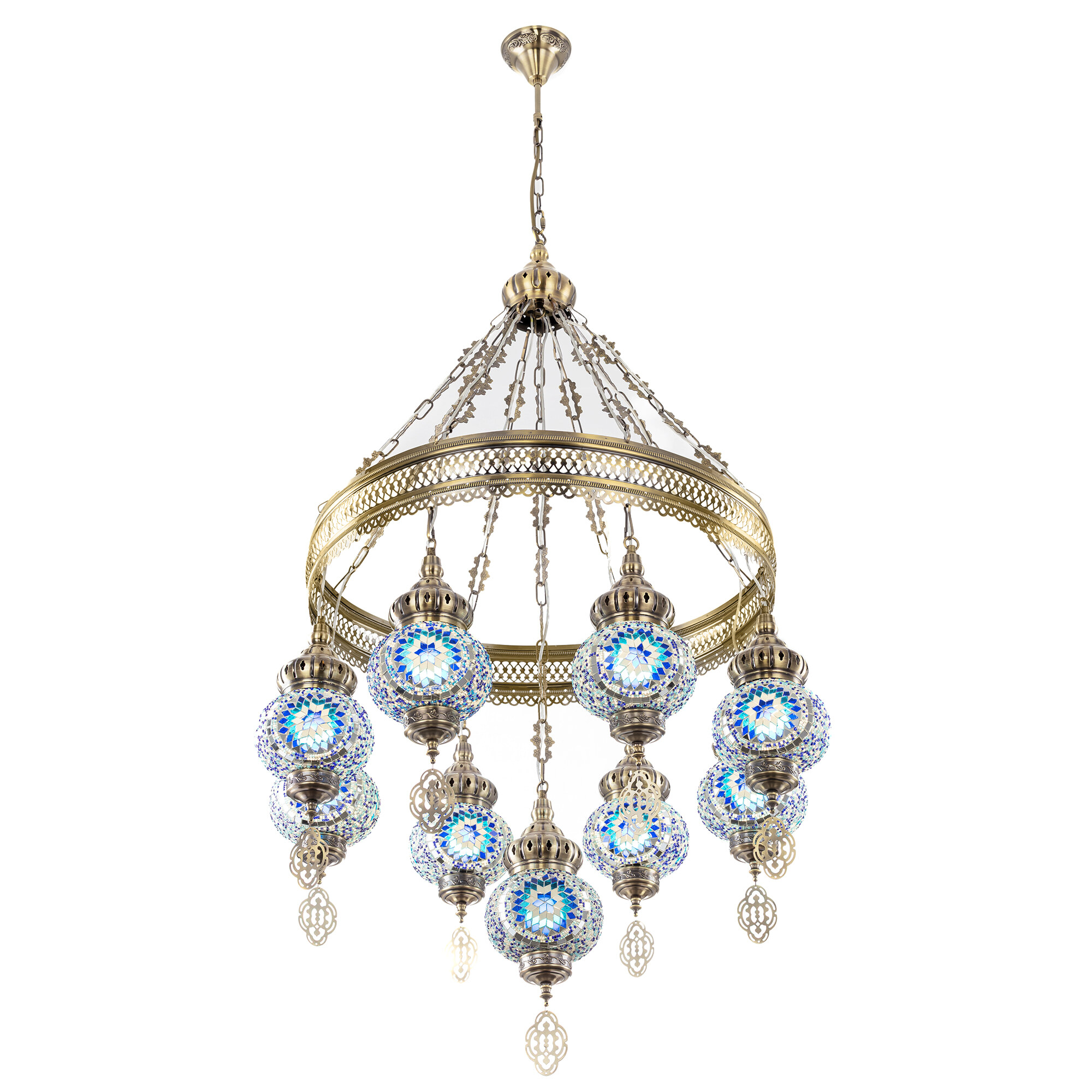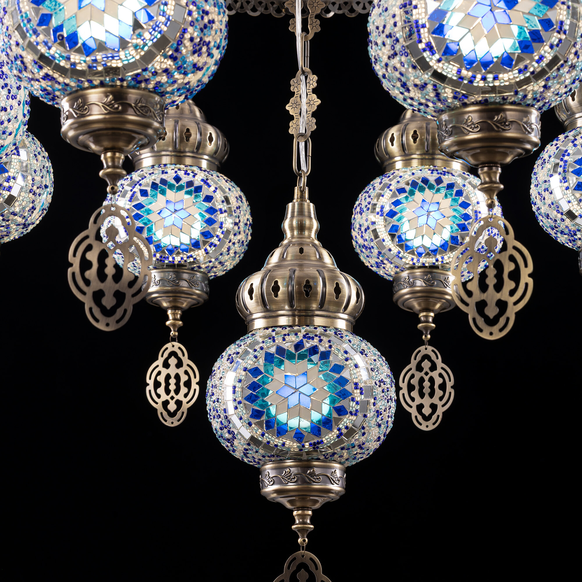 Девять подвесных плафонов, выполненных в форме слегка приплюснутых шаров, украшены мозаикой в сине-голубых оттенках. Это наполняет пространство чувством свежести и гармонии. Металлический каркас благородного бронзового цвета декорирован искусной чеканкой.