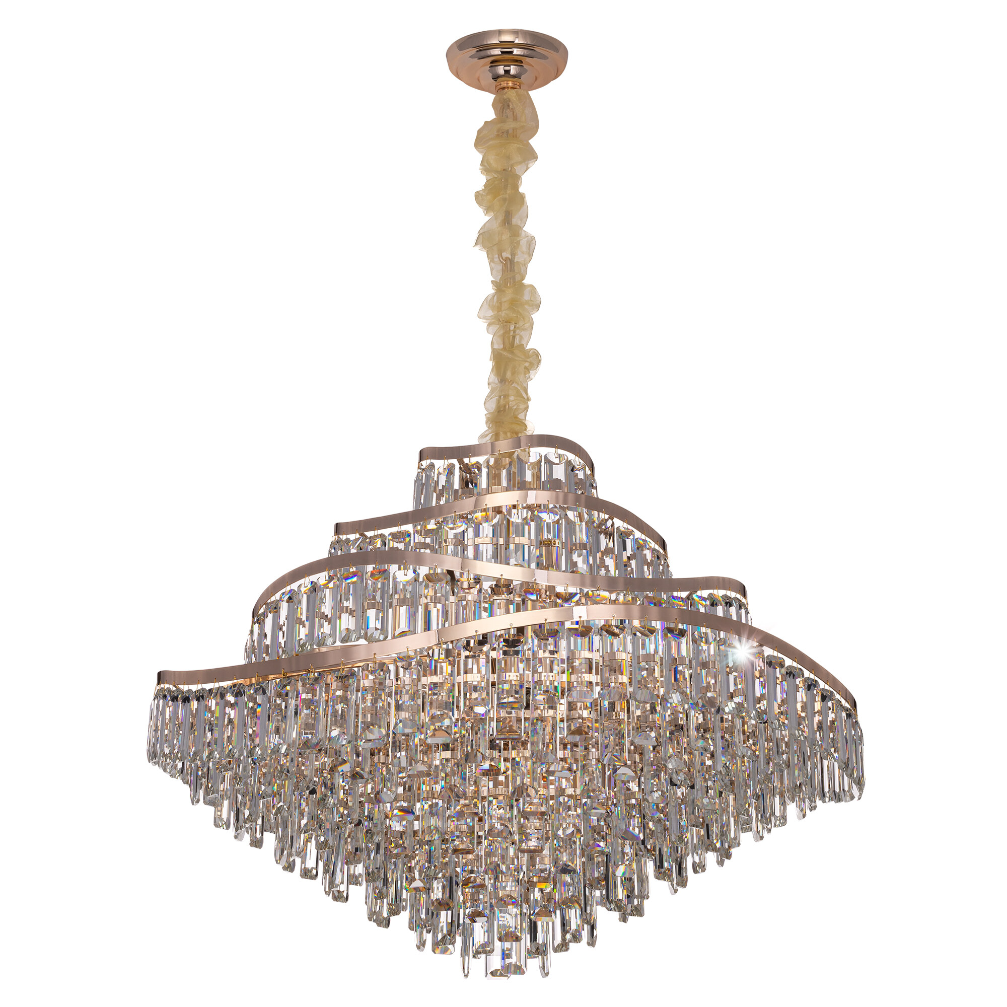 Металлический каркас с глянцевым золотым покрытием притягивает взгляд своим благородным блеском. Изогнутые, словно морские волны, кольца переливаются на свету, создавая динамичный и изменчивый образ в зависимости от ракурса. Роскошный облик формируют прямоугольные хрустальные подвески с современной огранкой — их кристальная чистота и геометрическая точность подчёркивают изысканность формы. Каждая грань хрусталя ловит свет, превращая его в тысячи искрящихся бликов, которые наполняют пространство торжественным сиянием.