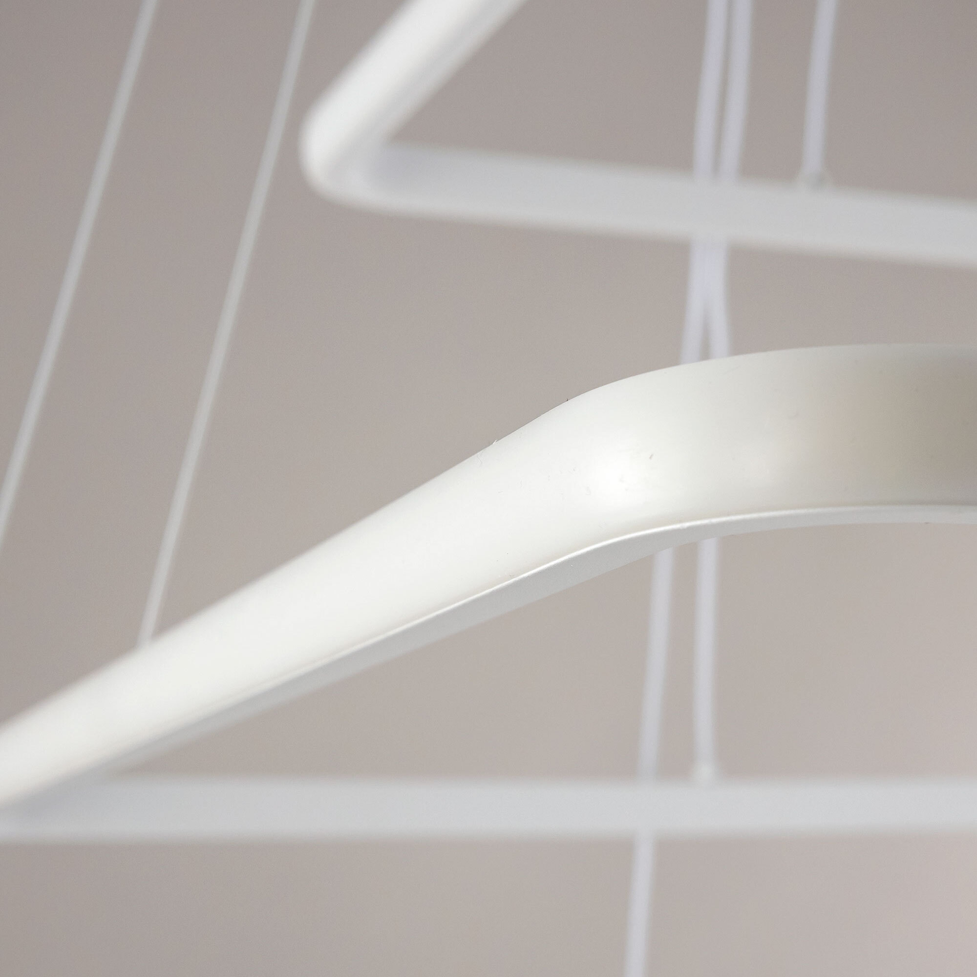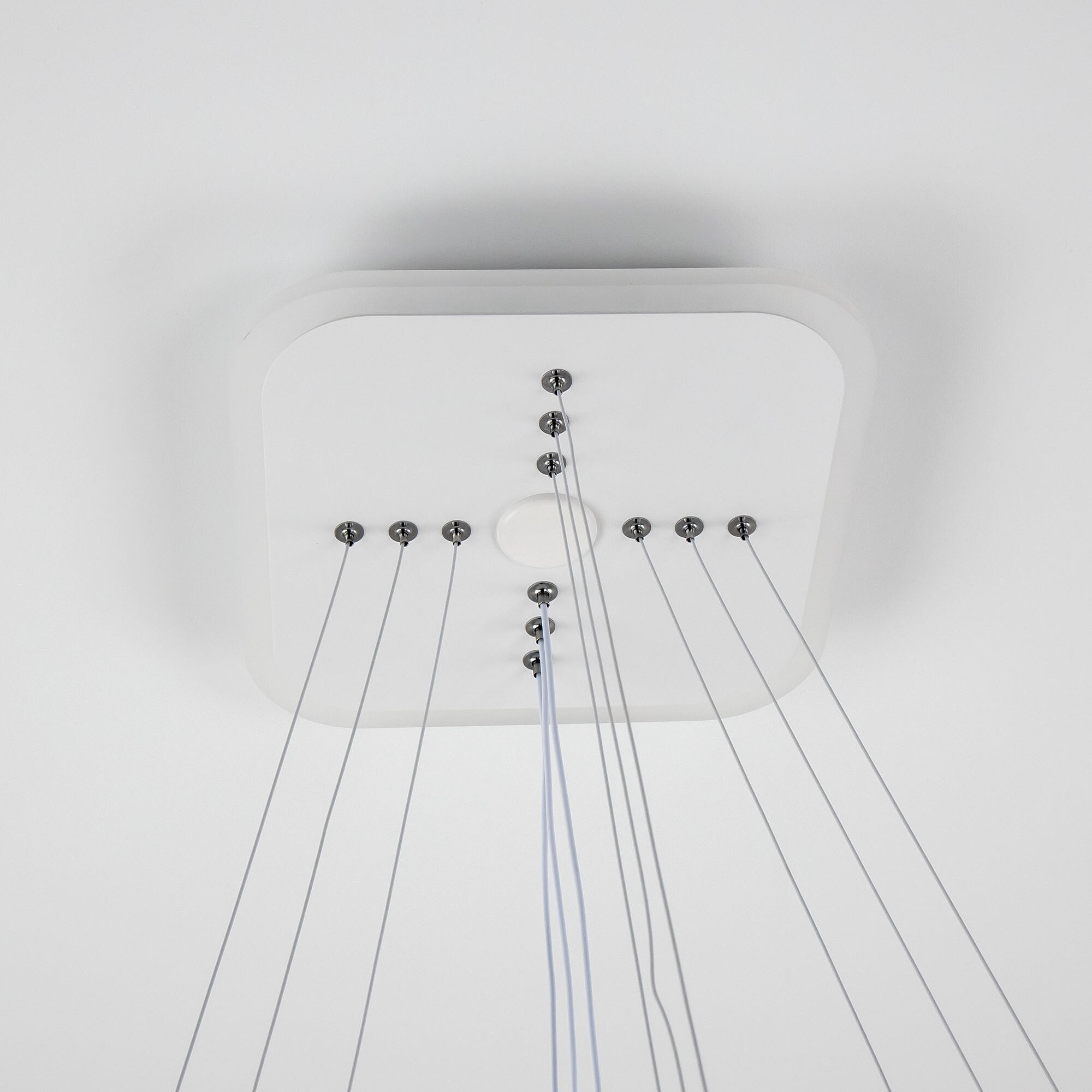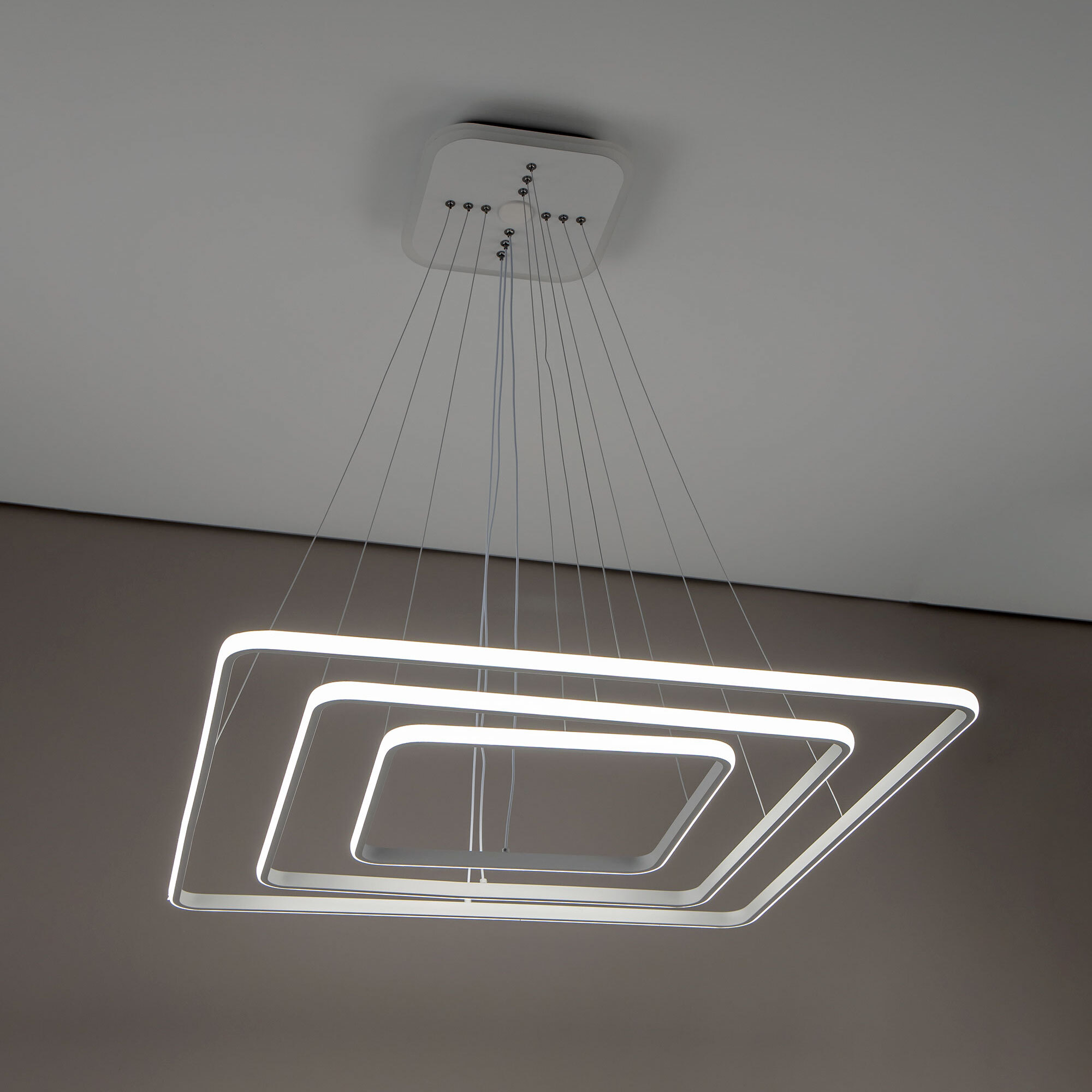 Люстра на тросах, в форме каскада из трех подвесных квадратных колец, высоту и угол наклона каждого из которых можно изменить. Корпус изготовлен из алюминиевого сплава, рассеиватель оптический полимер, цвет белый матовый. Крепление люстры подходит для всех типов потолков, в том числе натяжных. Тип крепления – планка.